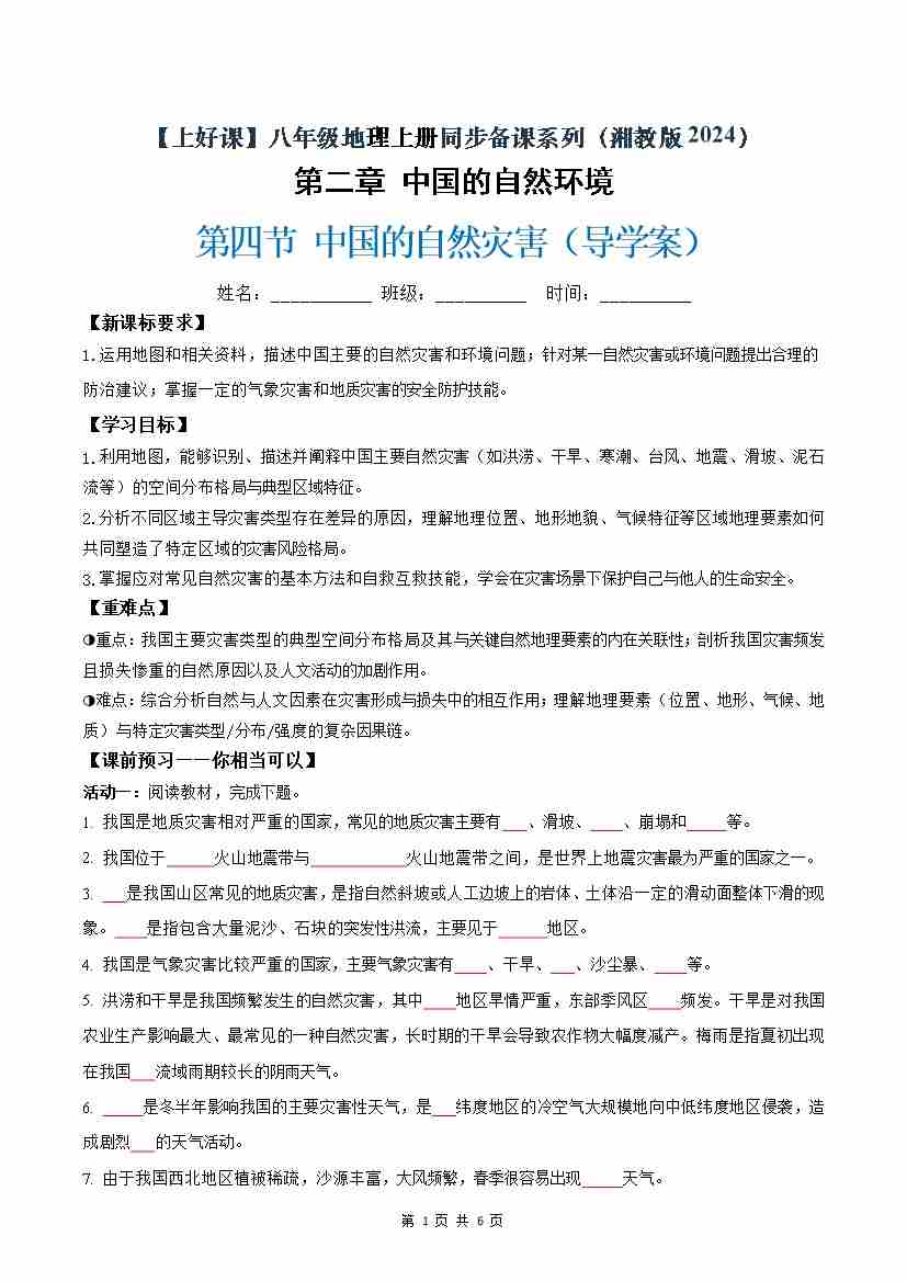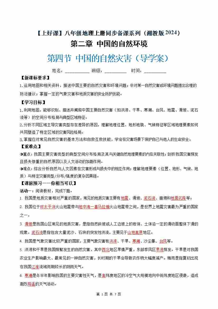 2.4中国的自然灾害(导学案)(试卷版)