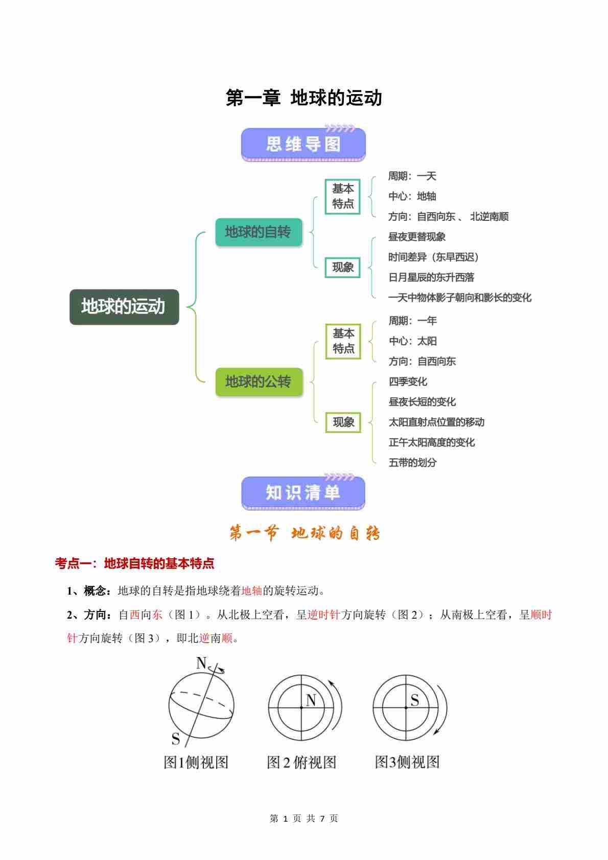 第1章 地球的运动(知识清单)(背记版)---中图版