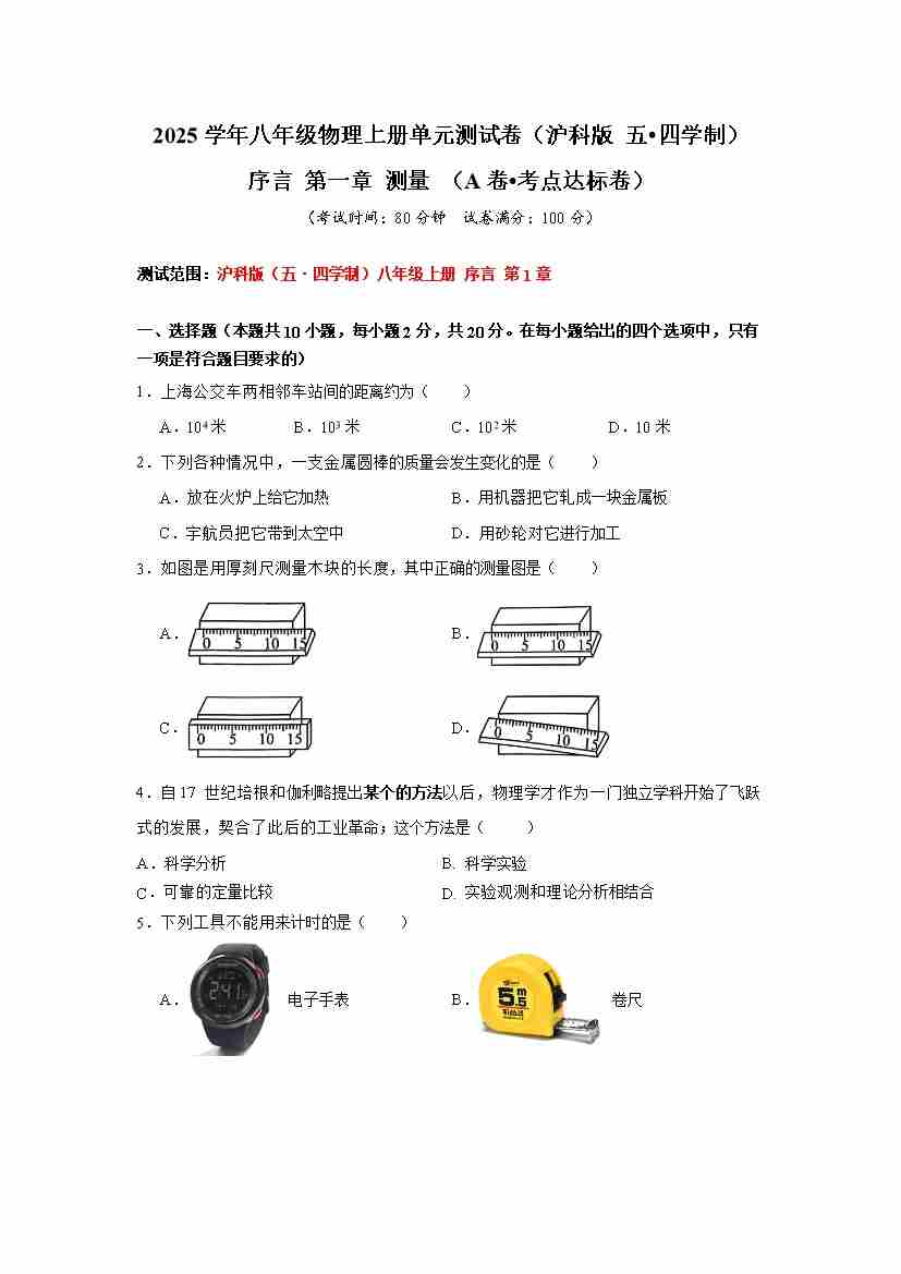 序言 第一章 测量 【A卷 达标卷】(原卷版)