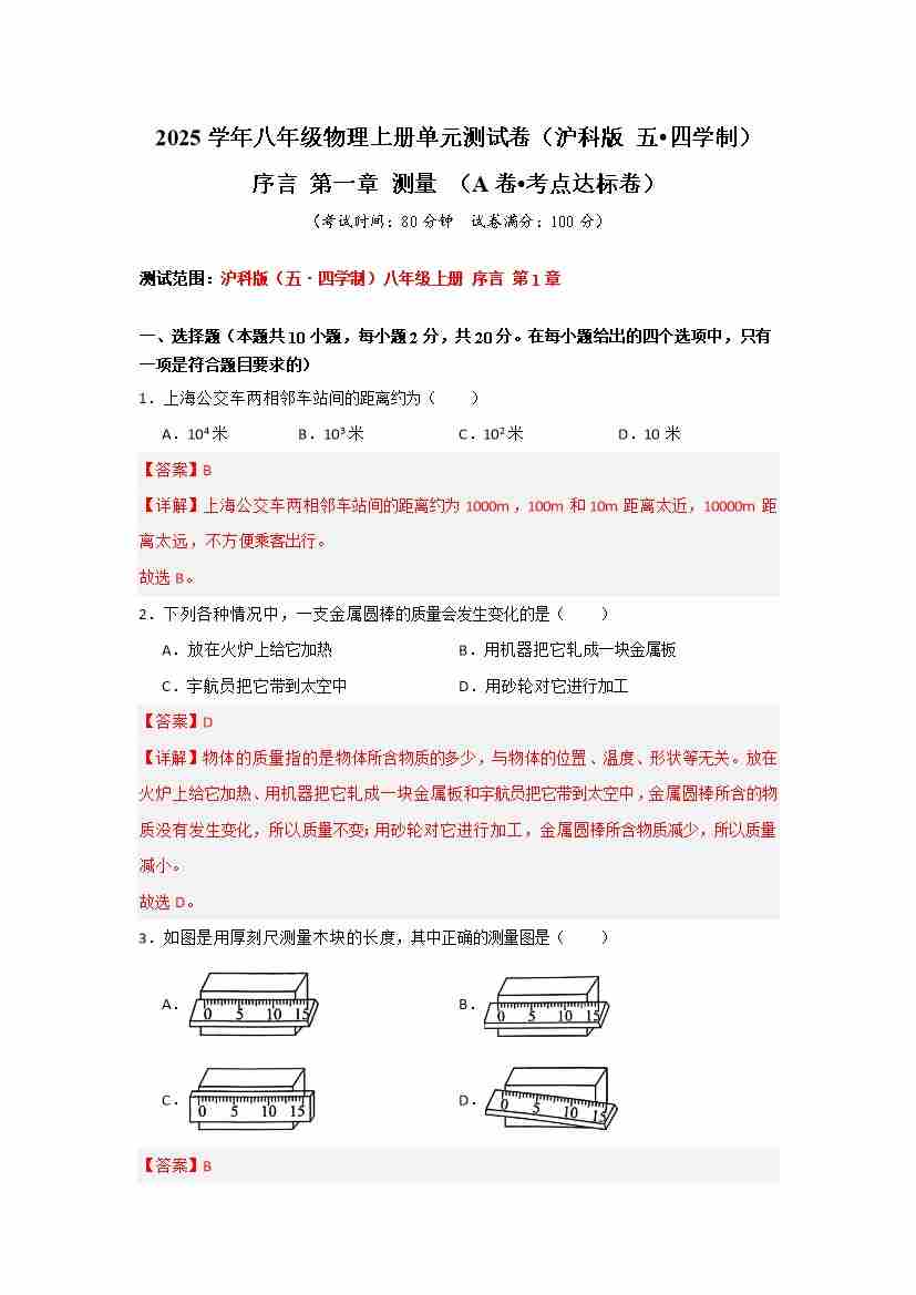 序言 第一章 测量 【A卷 达标卷】(解析版)