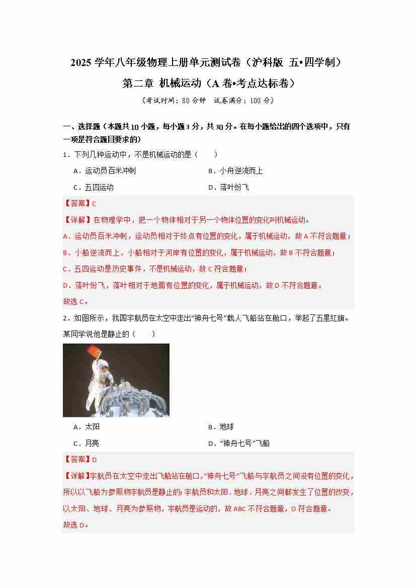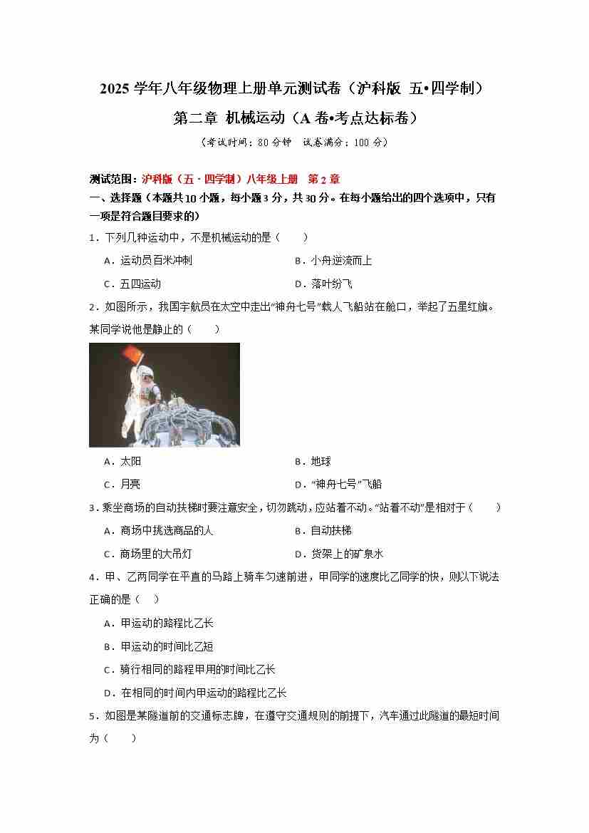 第二章 机械运动 【A卷 达标卷】(原卷版)