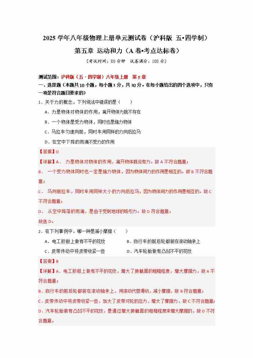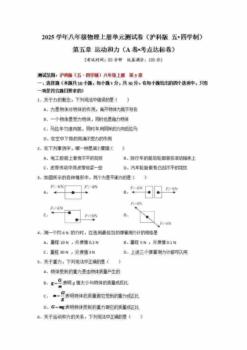 第五章 运动和力 【A卷 达标卷】(原卷版)