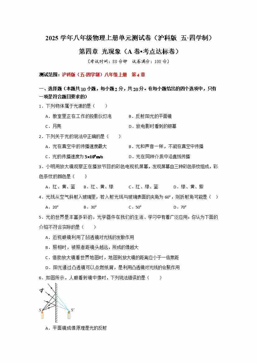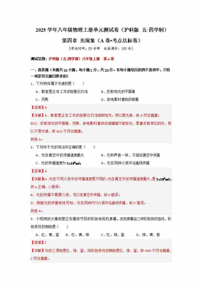 第四章 光现象【A卷 达标卷】(原卷版)