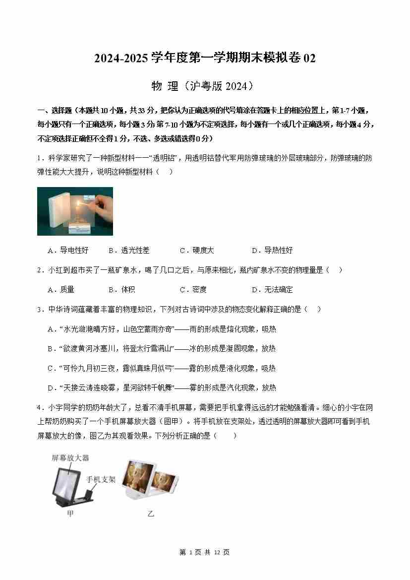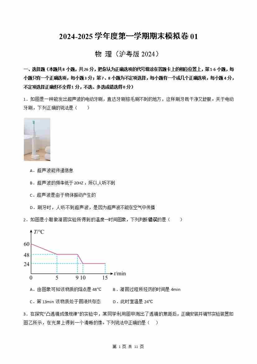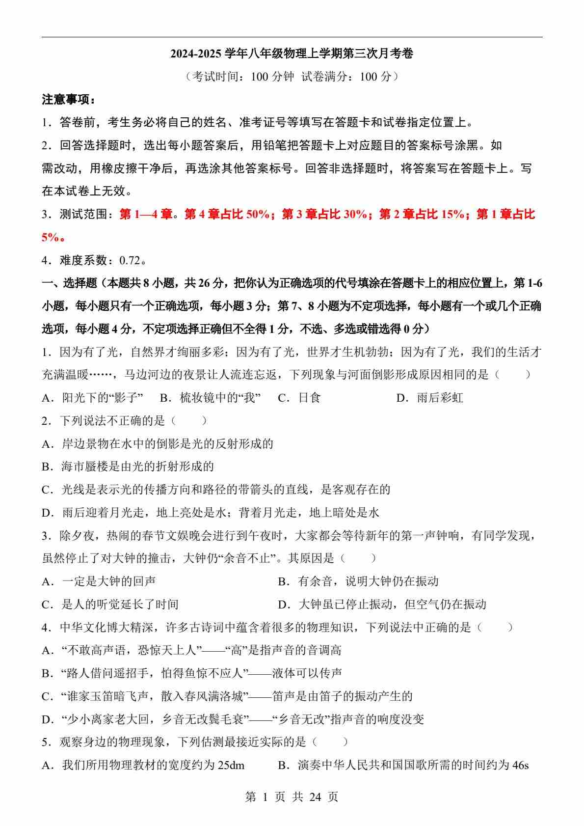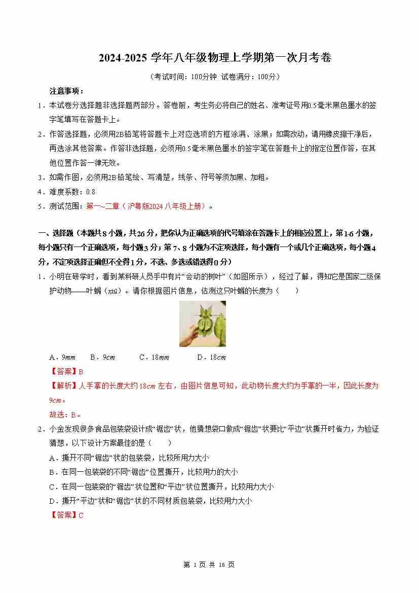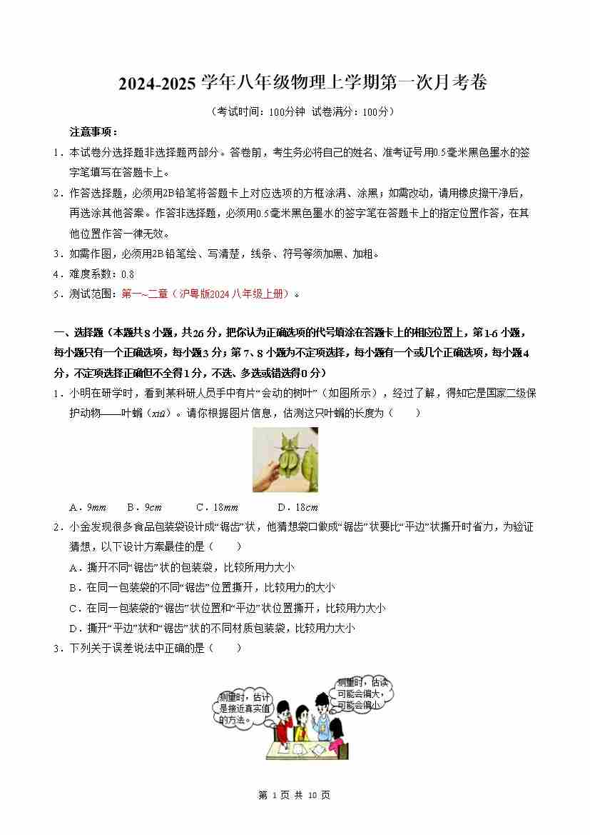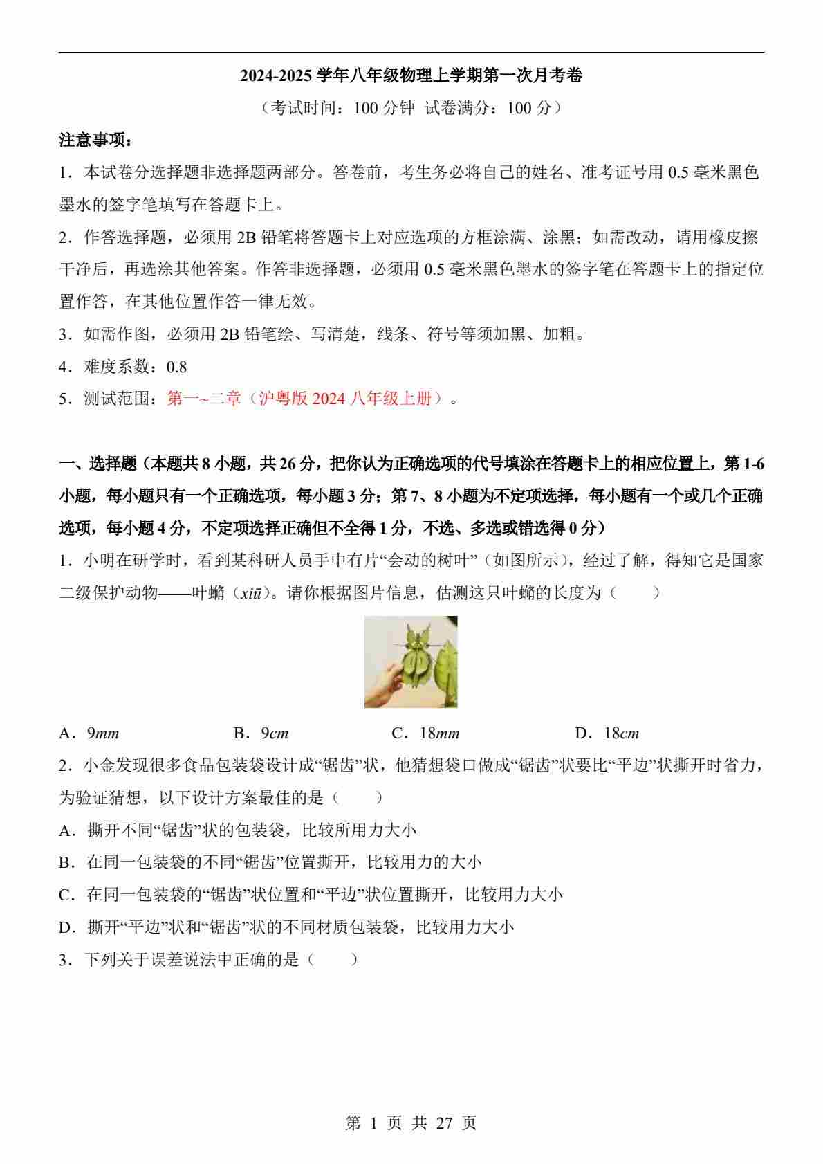 八年级上学期物理第一次月考卷(考试版A4)【考试范围:第1~2章】(沪粤版2024)