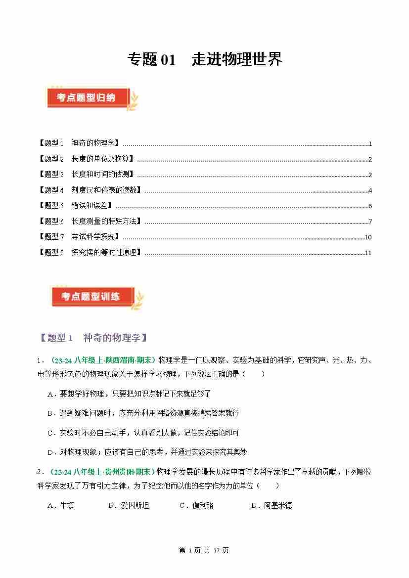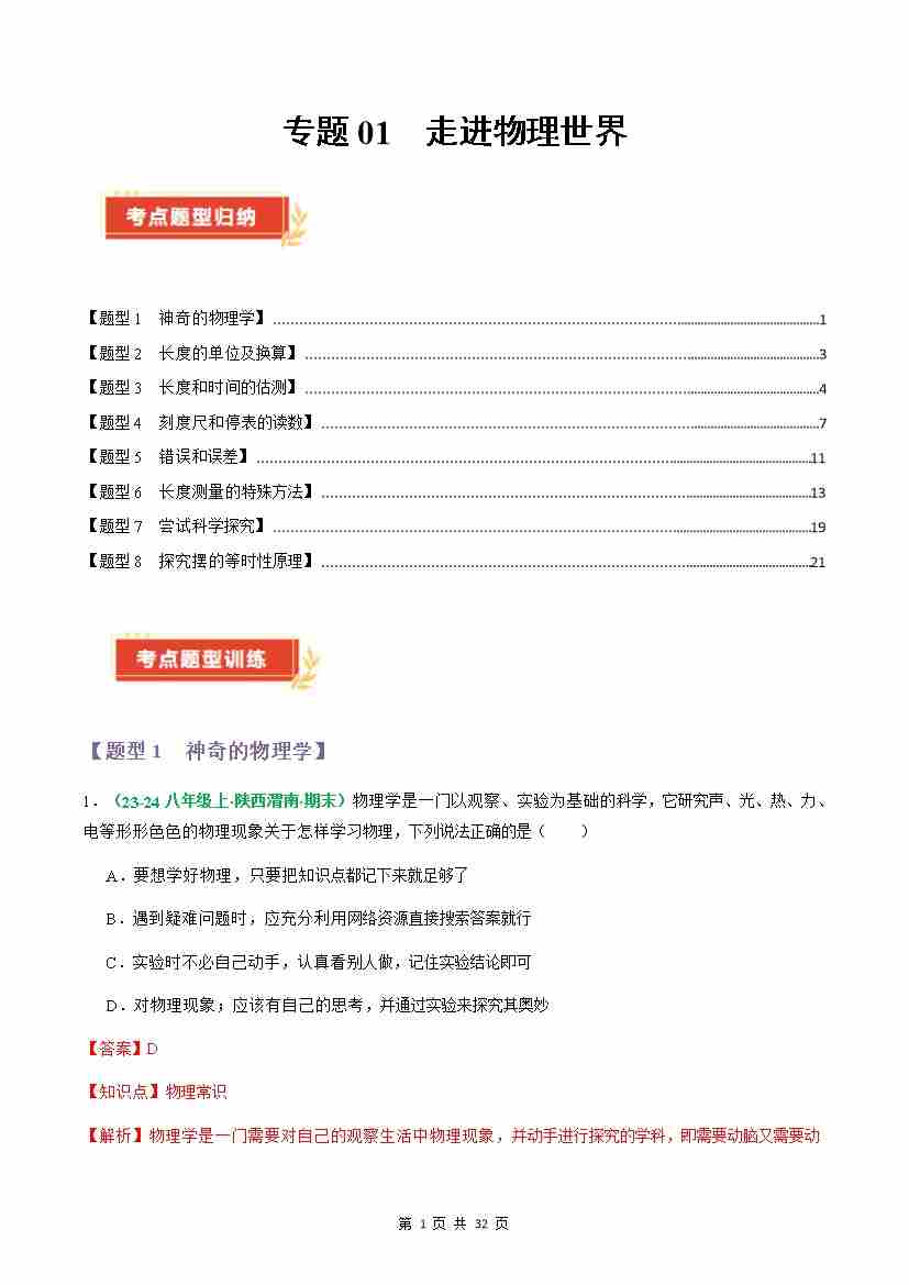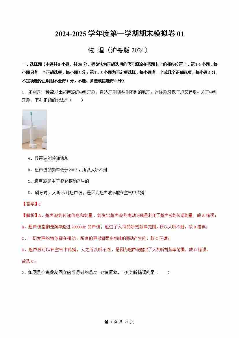 八年级上学期物理第一次月考卷(全解全析)(沪粤版2024)