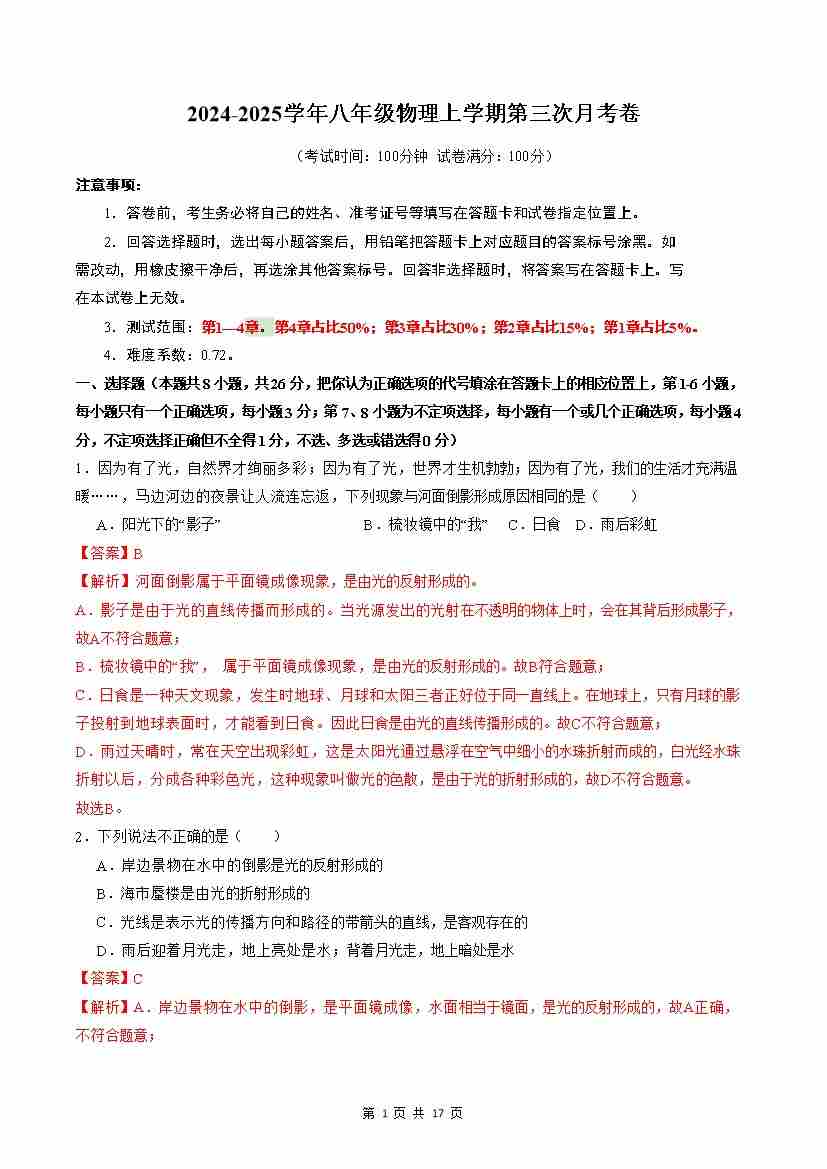 八年级物理第三次月考卷(全解全析)(沪粤版2024)17