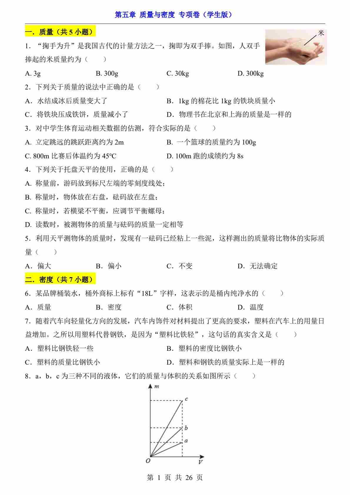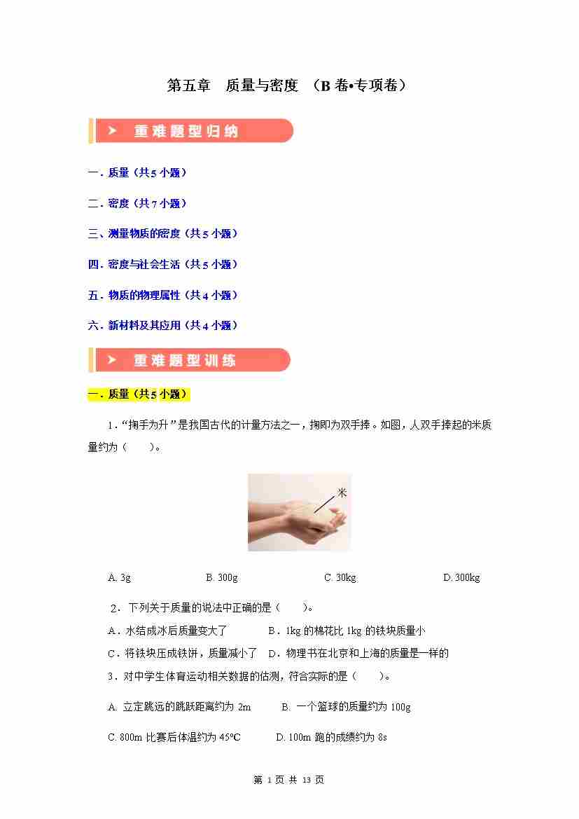 第5章质量与密度【B卷专项卷】(重难训练30题6大考点)(原卷版)