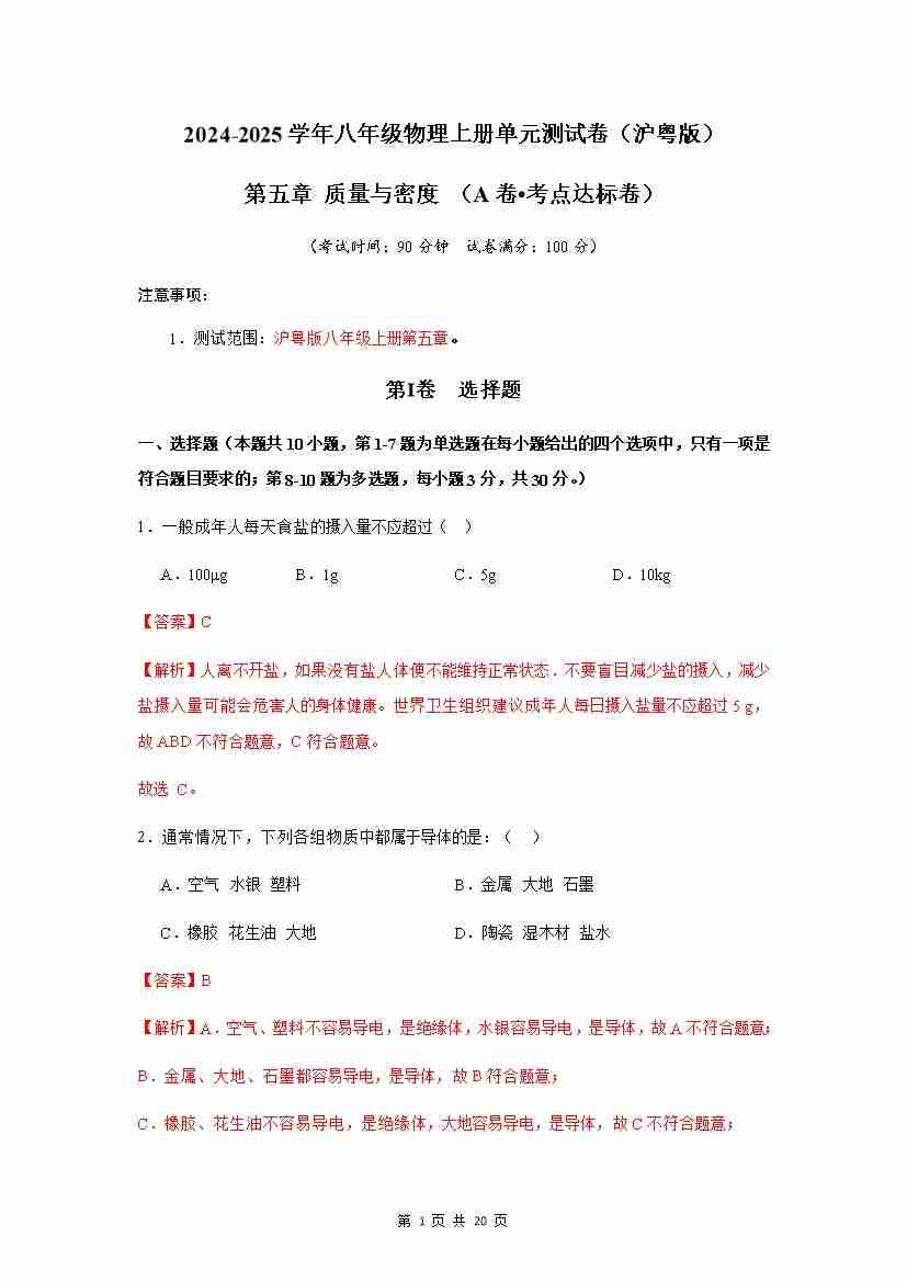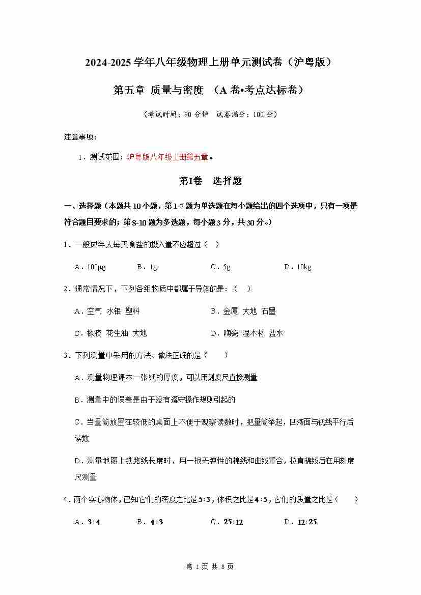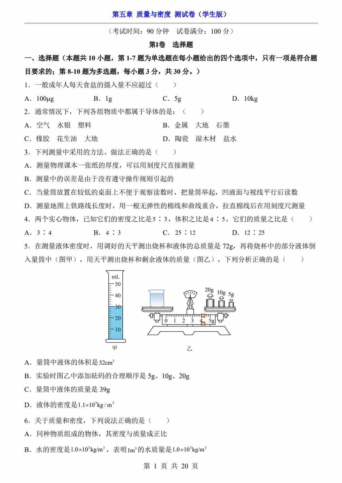 第5章质量与密度-【A卷达标卷】(原卷A4版)