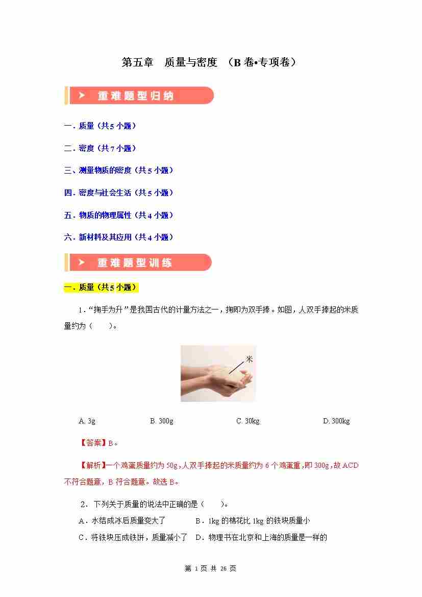 第5章质量与密度【B卷专项卷】(重难训练30题6大考点)(解析版)