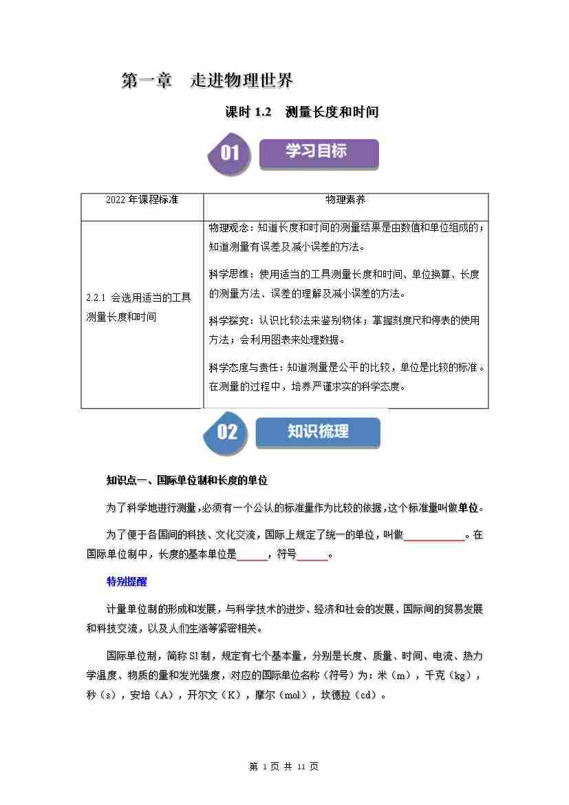 1.2 测量长度和时间(原卷版)