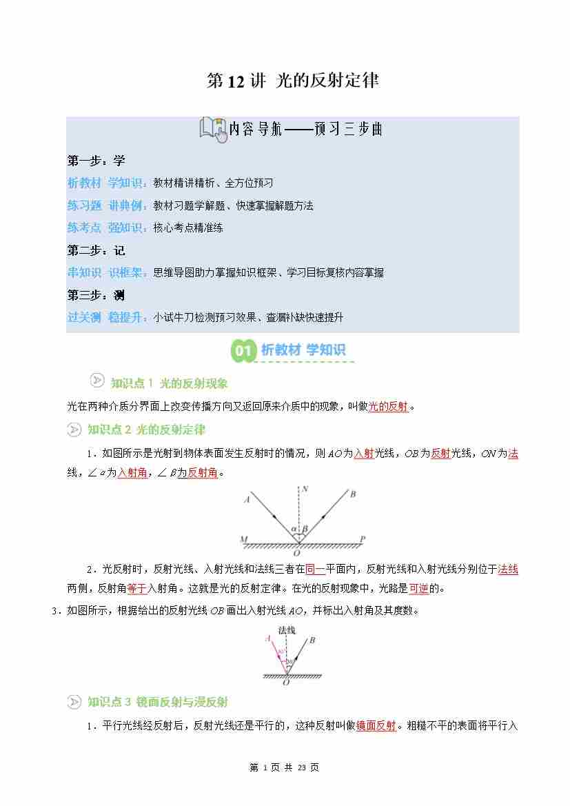 第12讲:光的反射定律(预习)(原卷版)