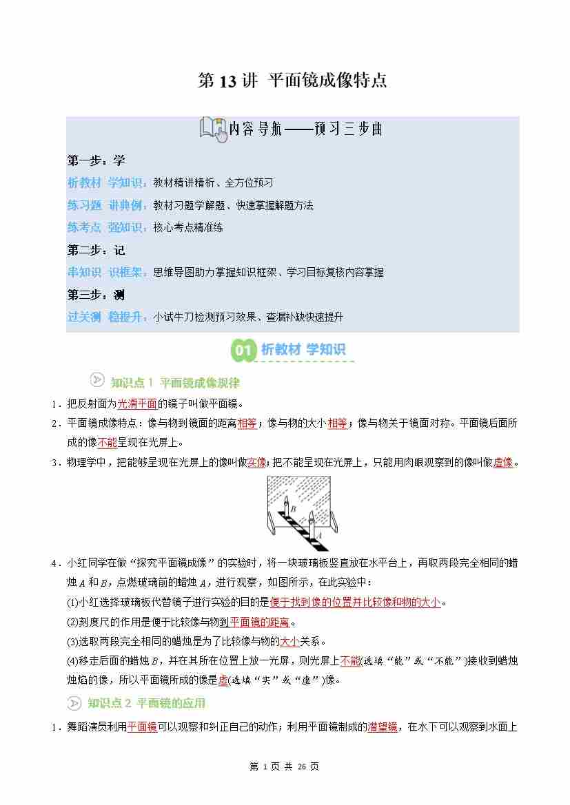 第13讲:平面镜成像特点(预习)(原卷版)