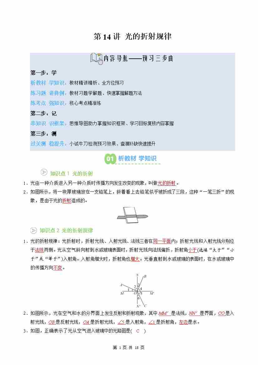 第14讲:光的折射规律(预习)(原卷版)