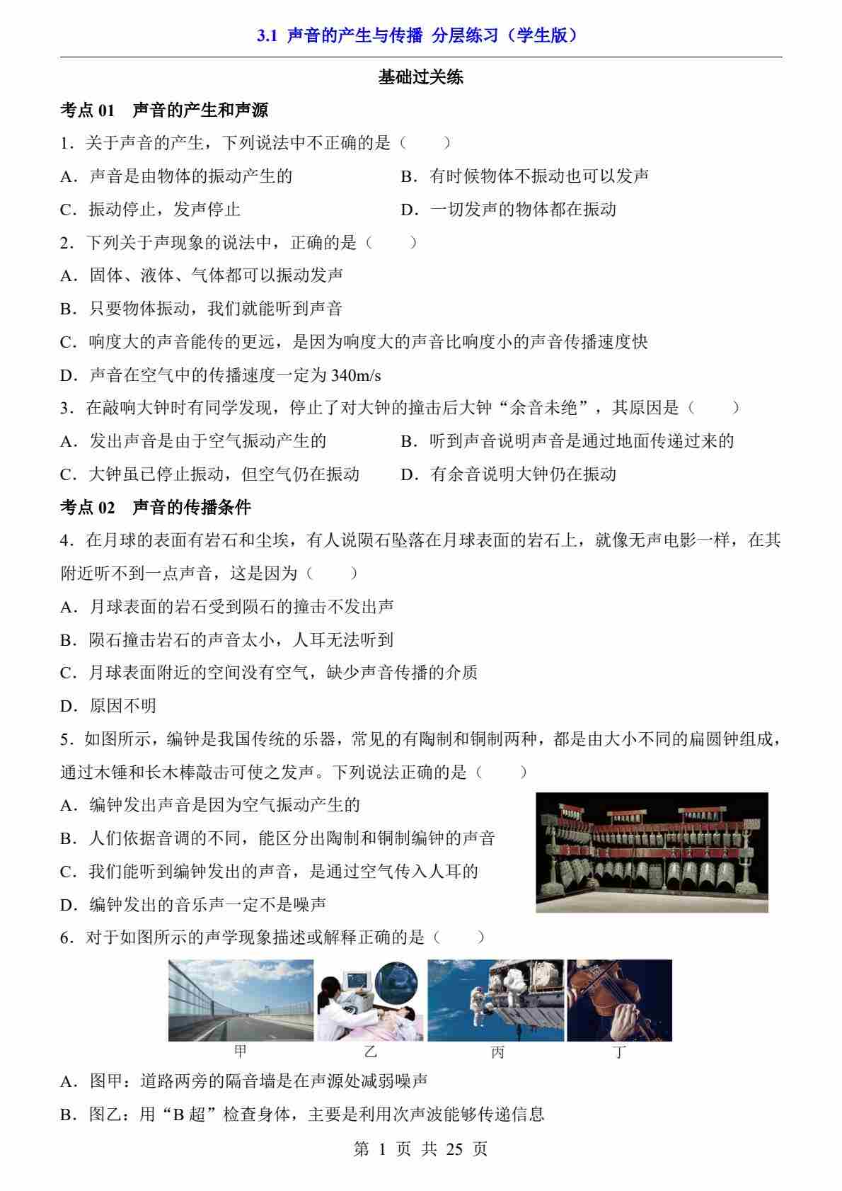 3.1 声音的产生与传播(分层练习)---北师版