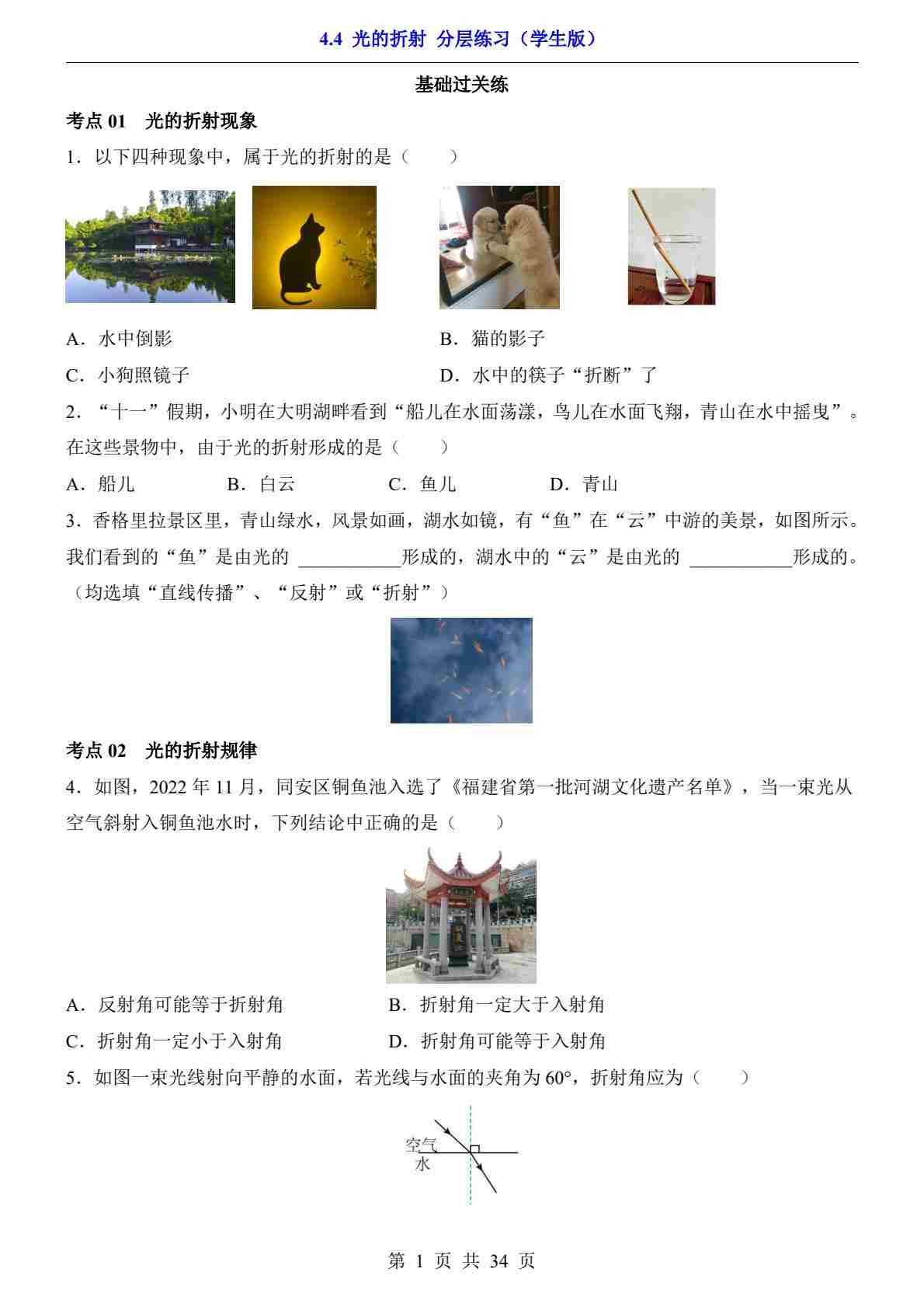 4.4 光的折射(分层练习)---北师版