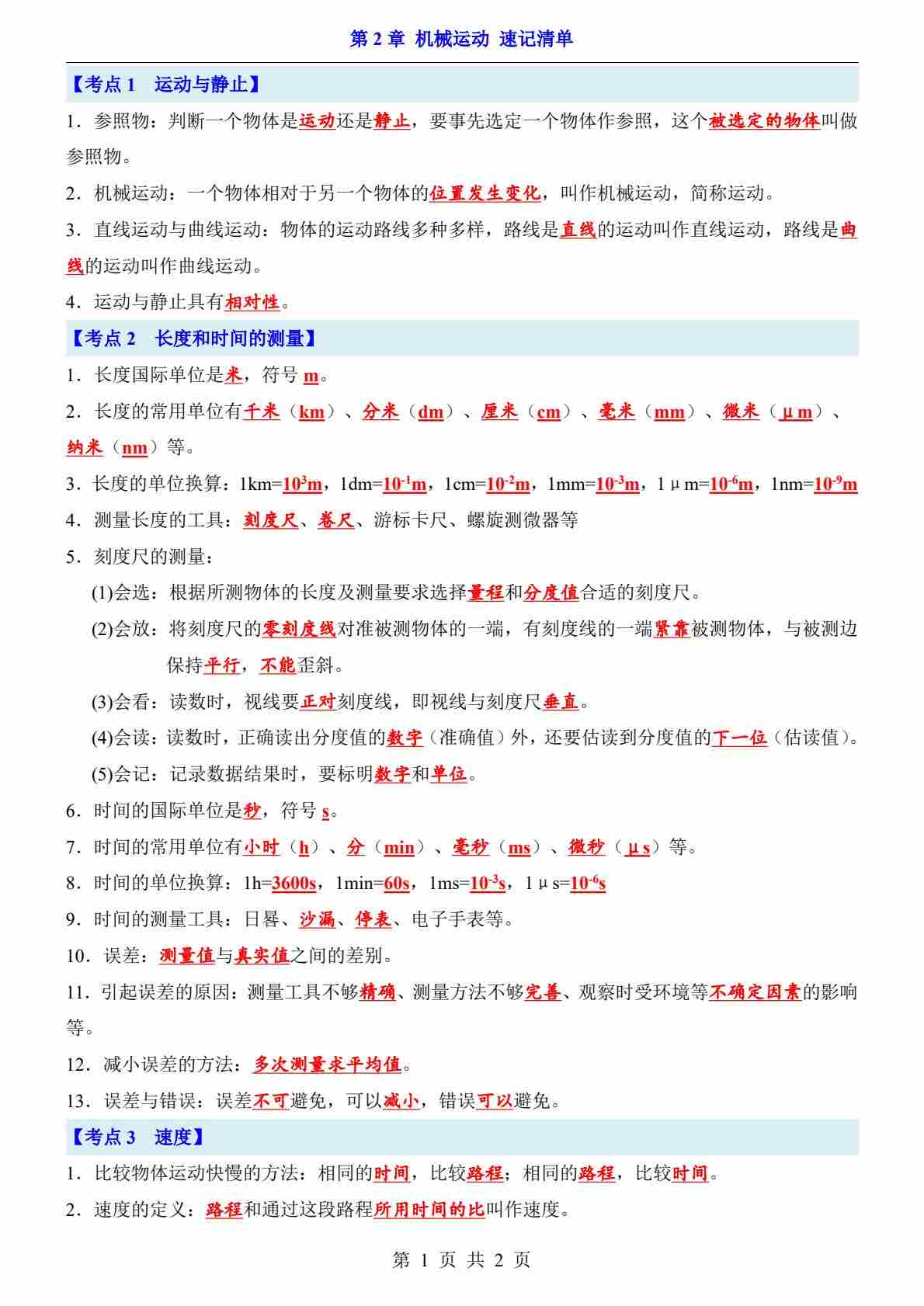 第2章 机械运动(知识清单)