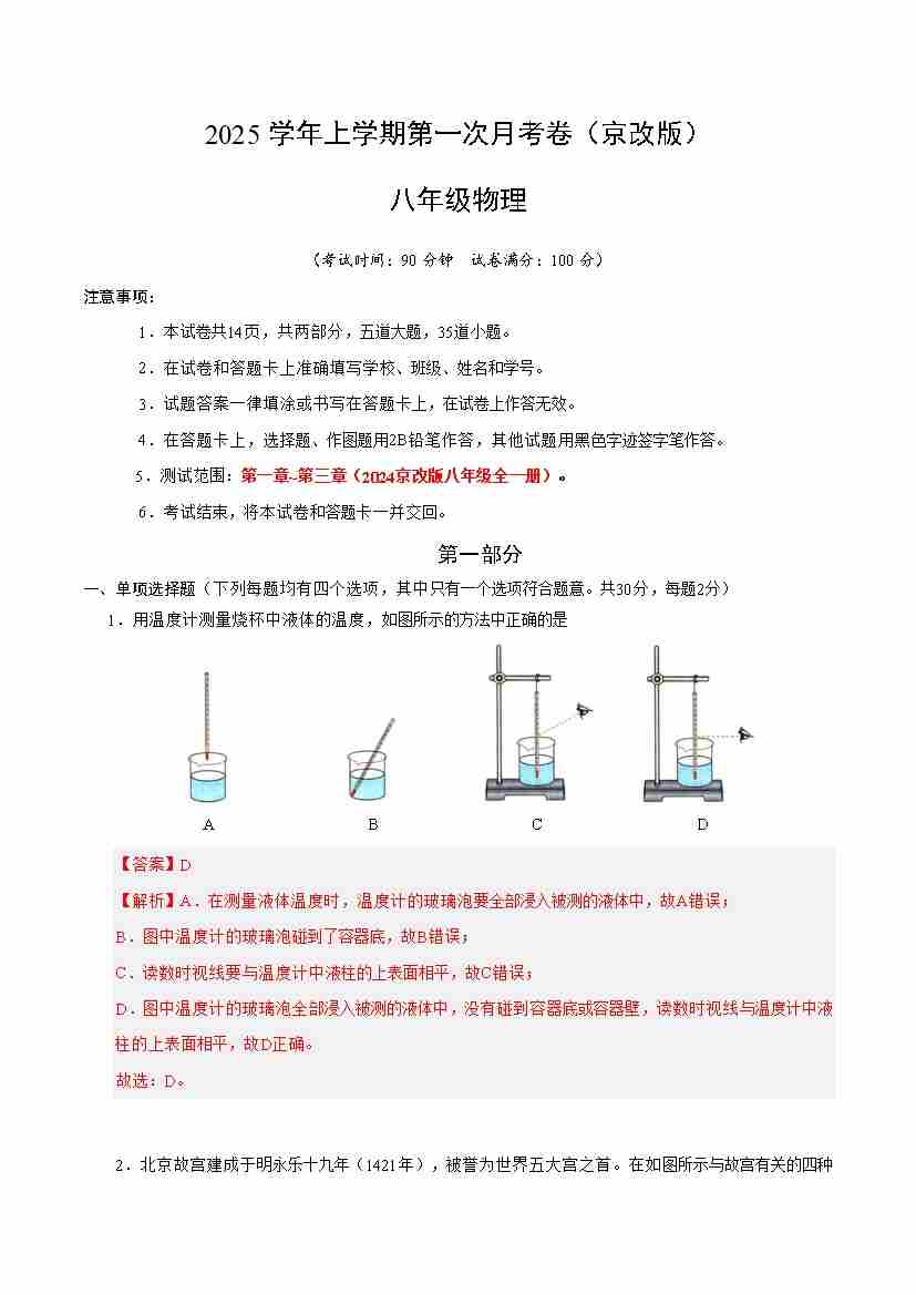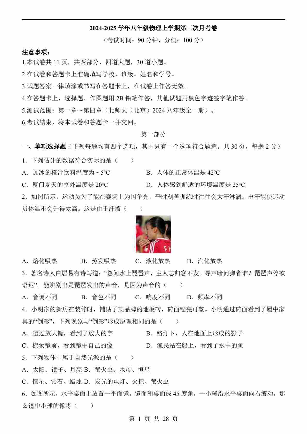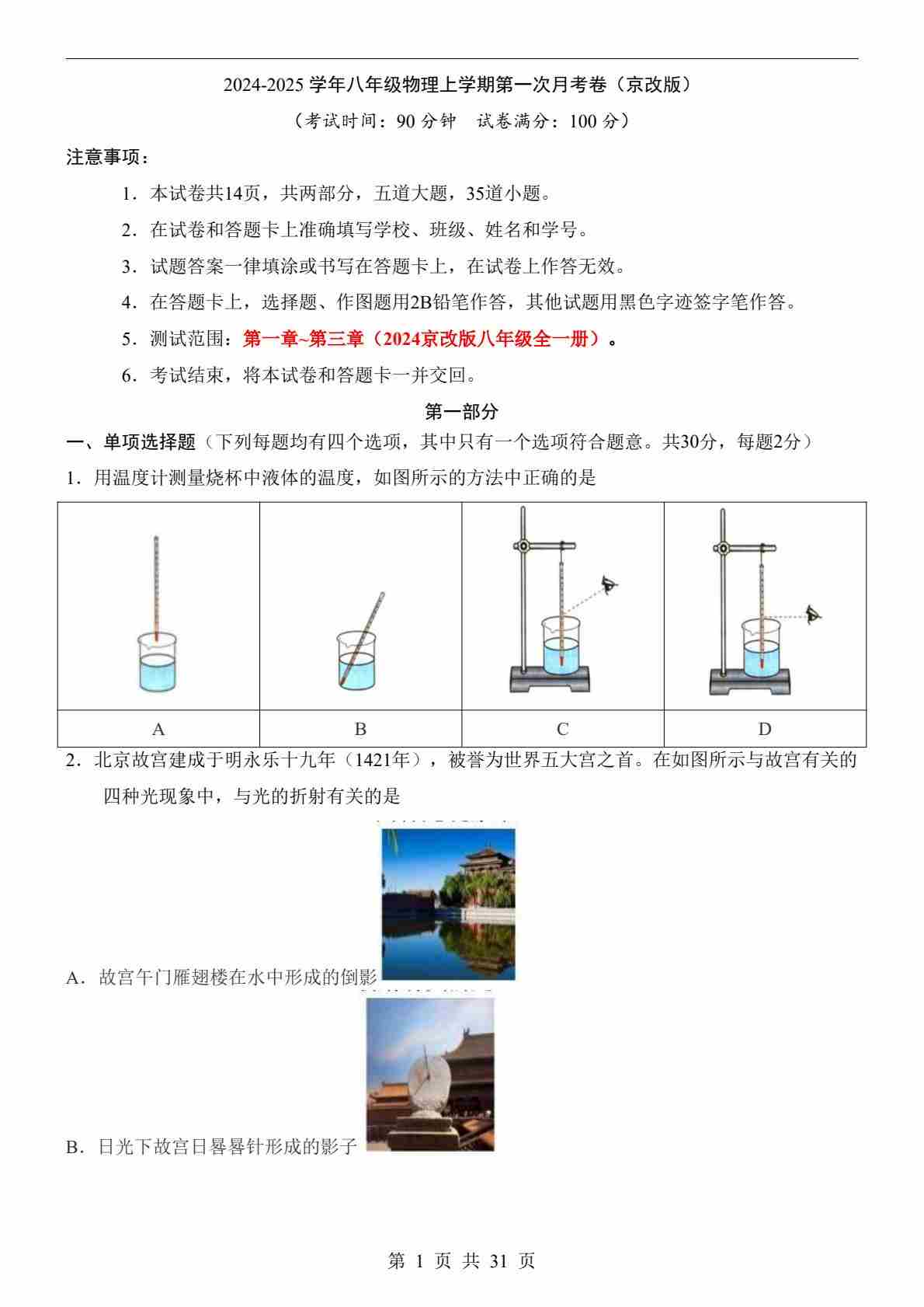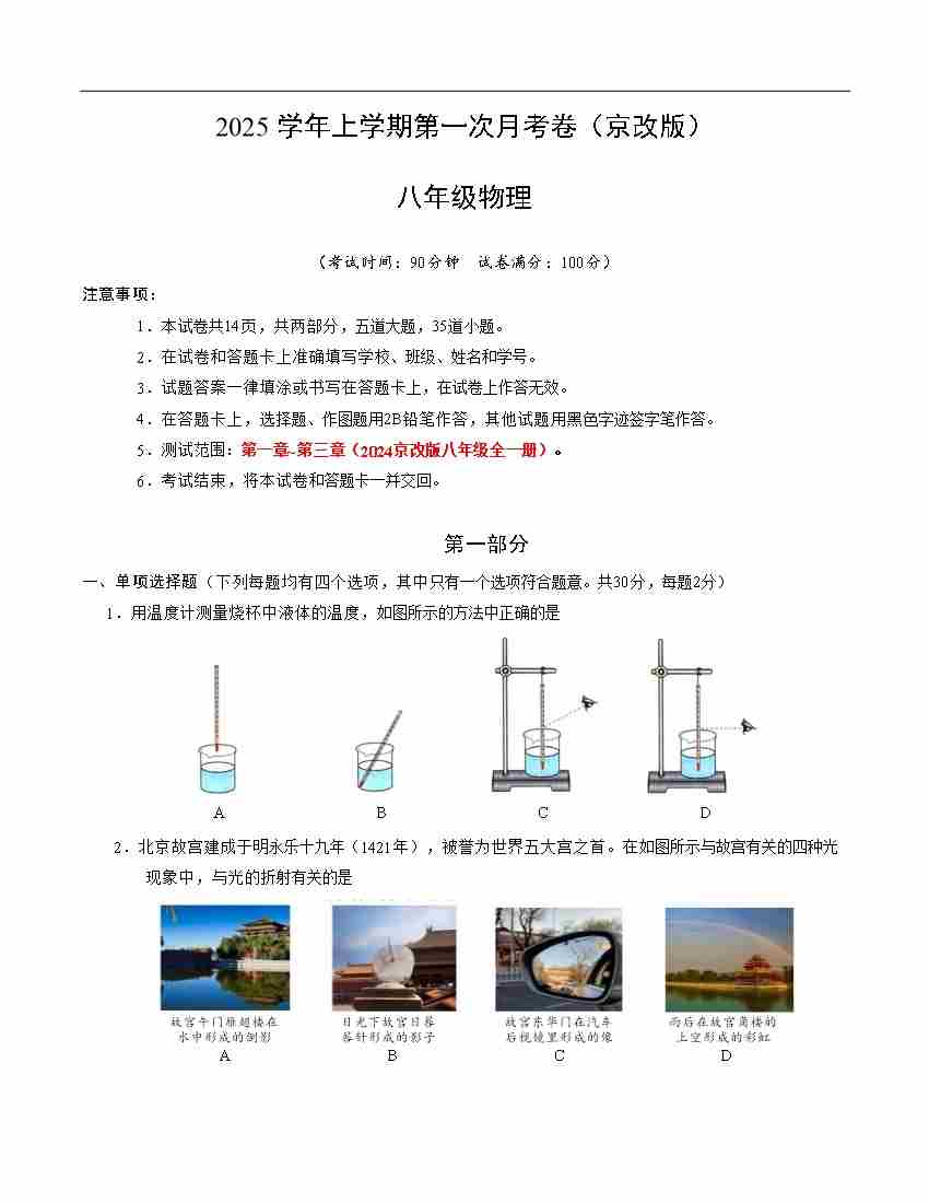 八年级物理第一次月考卷(考试版A4)(京改版)