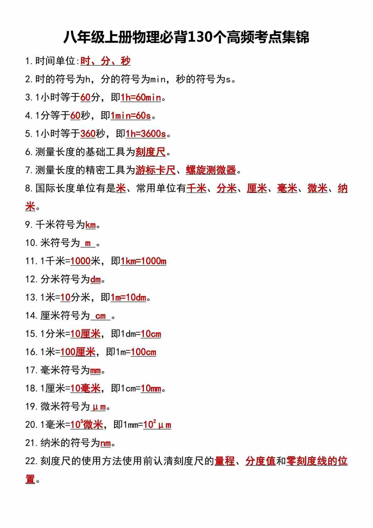 八上物理必背130个高频考点集锦
