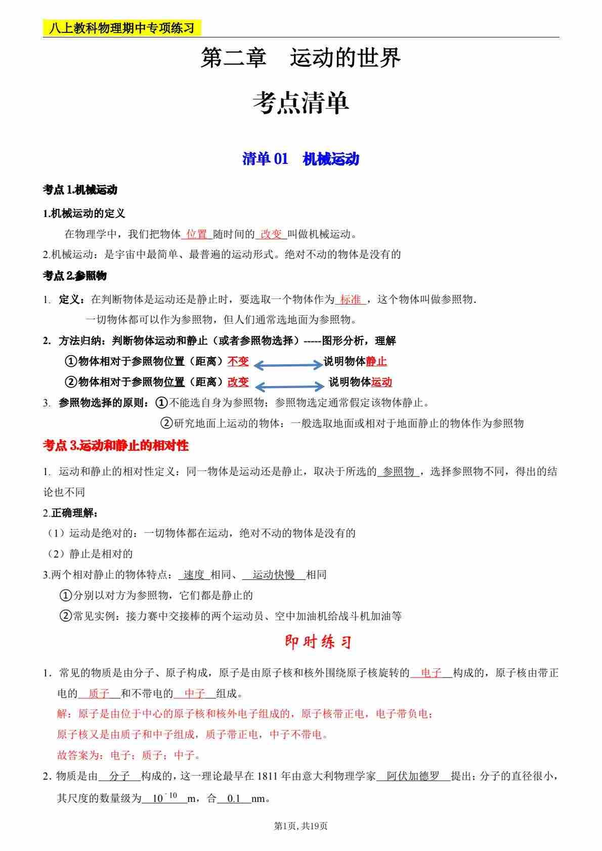 八上物理知识点默写+答案