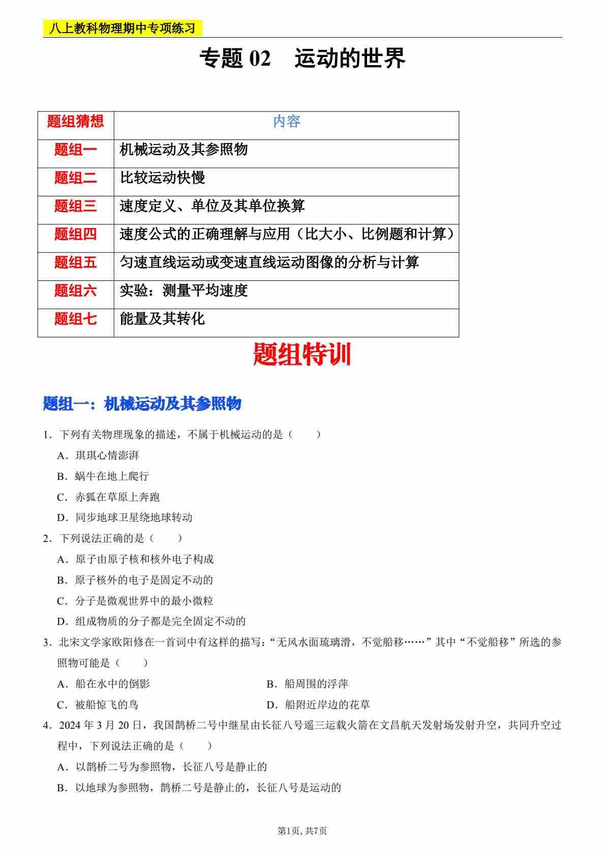 【八上教科物理】专题02 运动与能量(考题猜想)(原卷版)