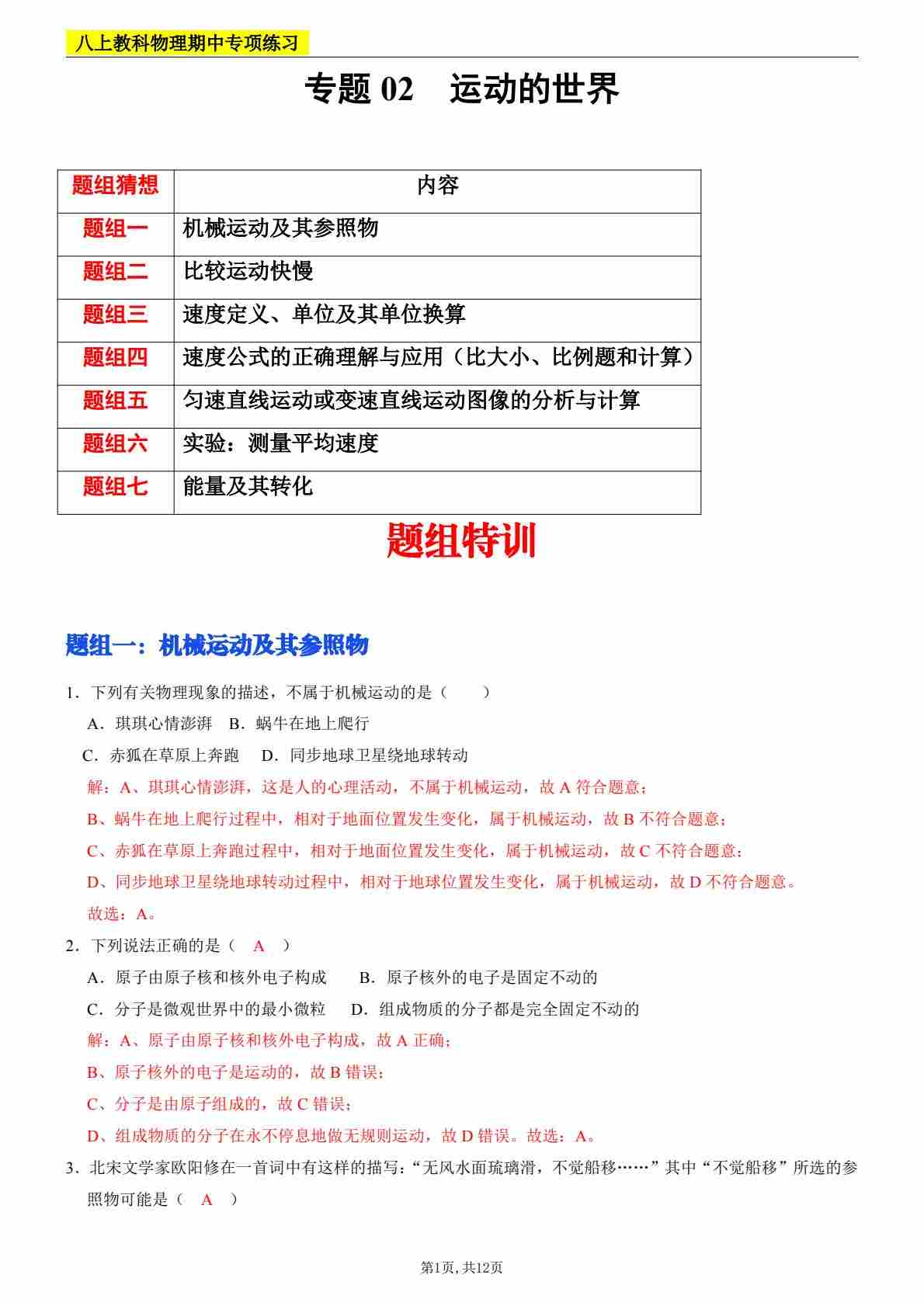 第1、2章:机械运动、运动和能量【A卷 达标卷】(解析版)