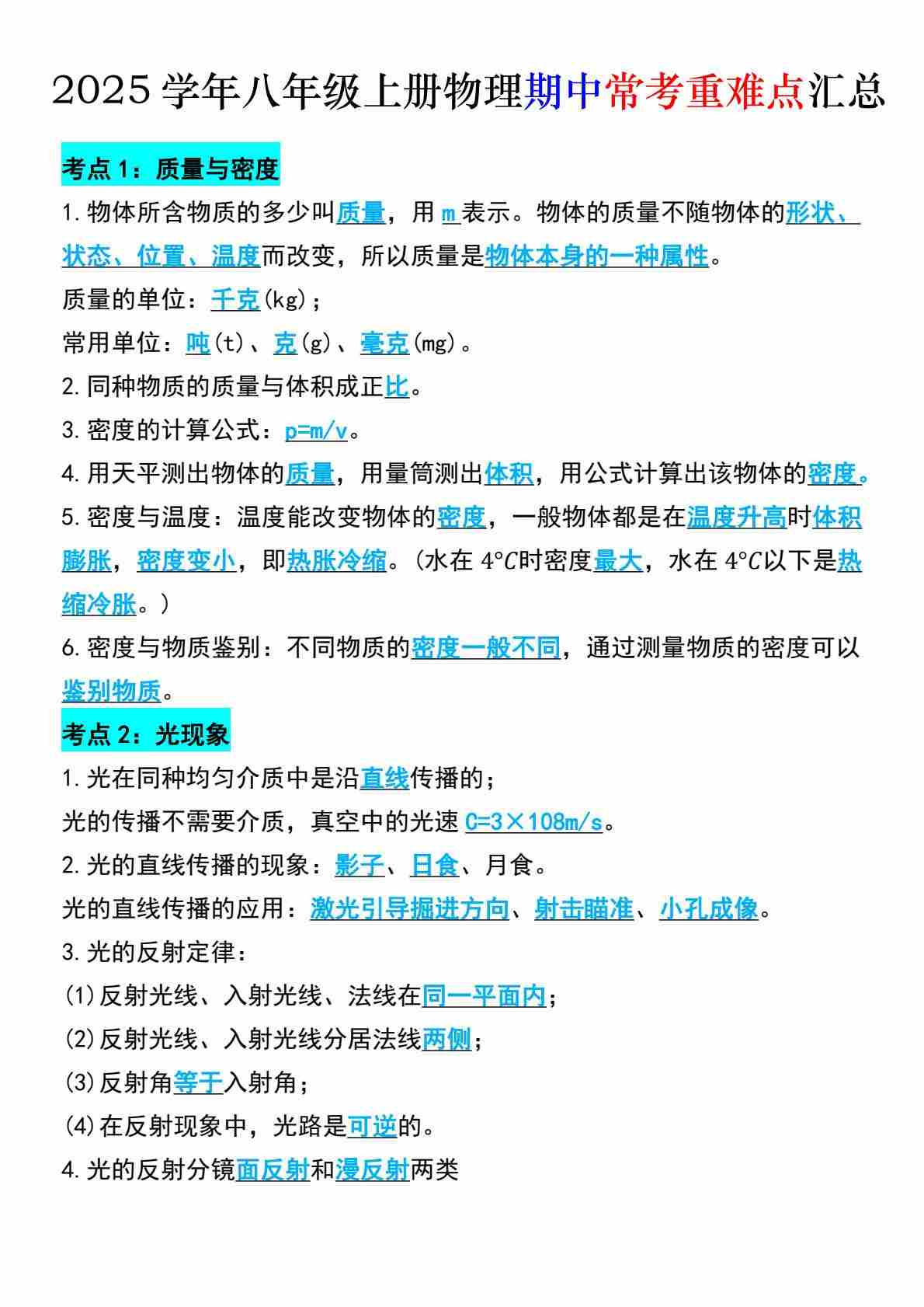 八上物理必考重要知识点93个