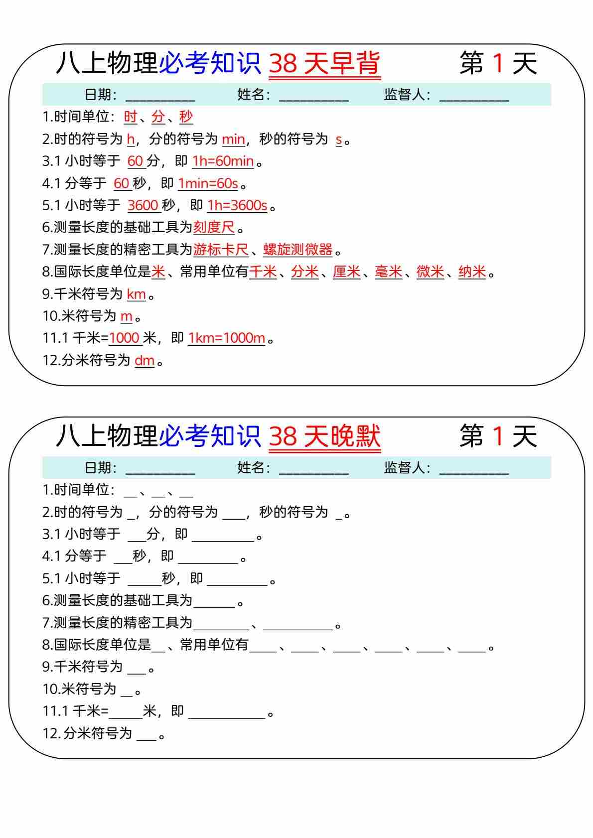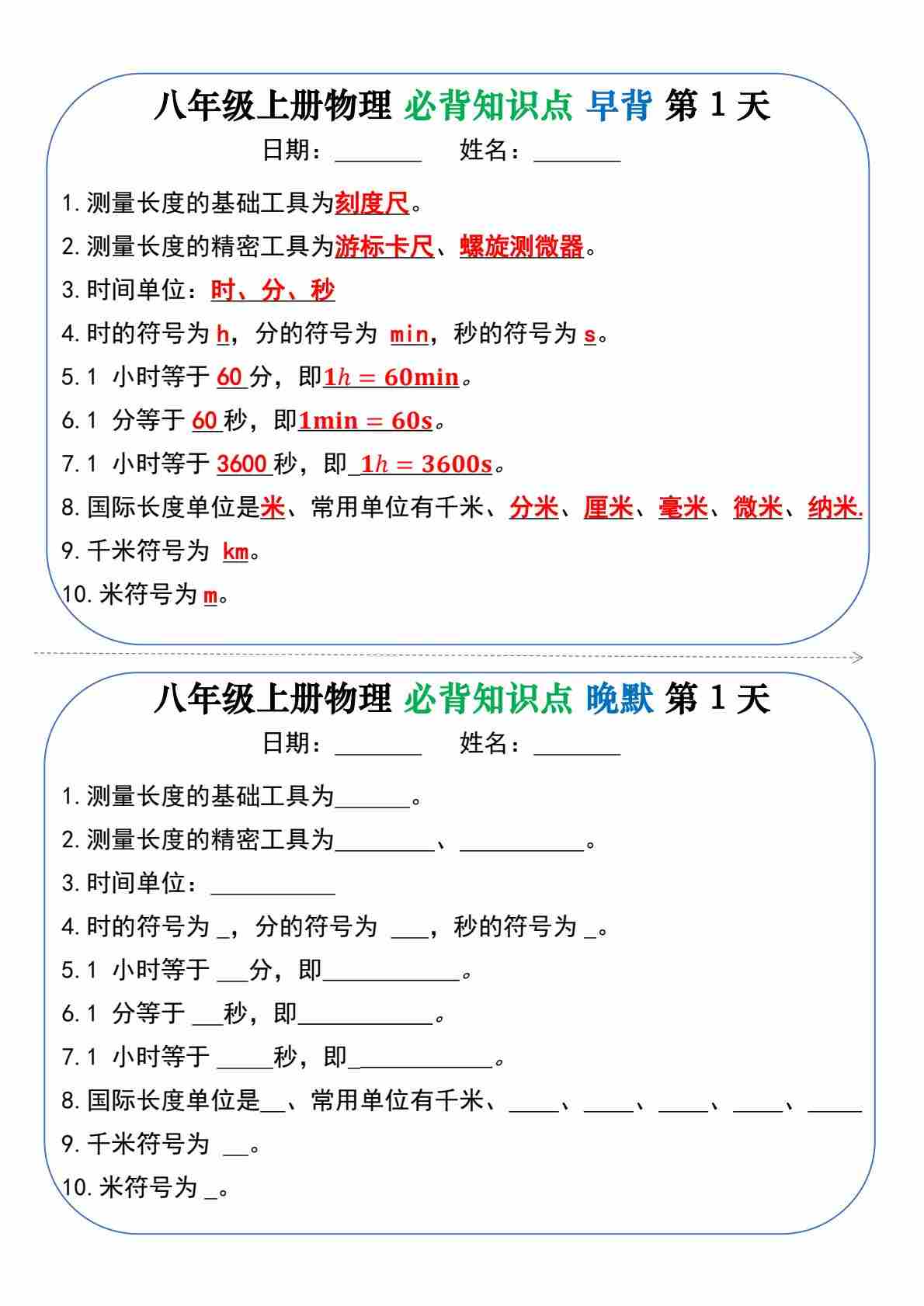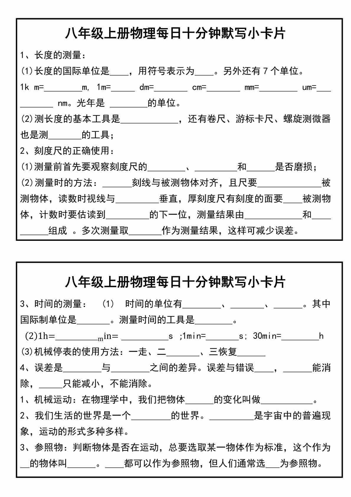 八上物理每日十分钟默写小卡片