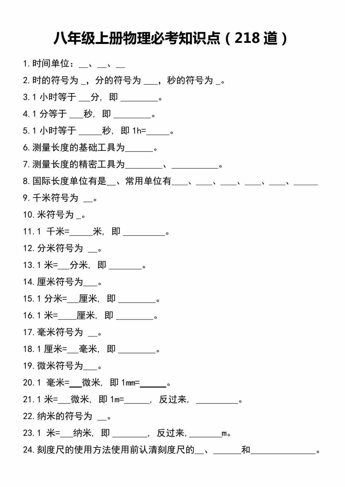 八上物理必考知识点218道