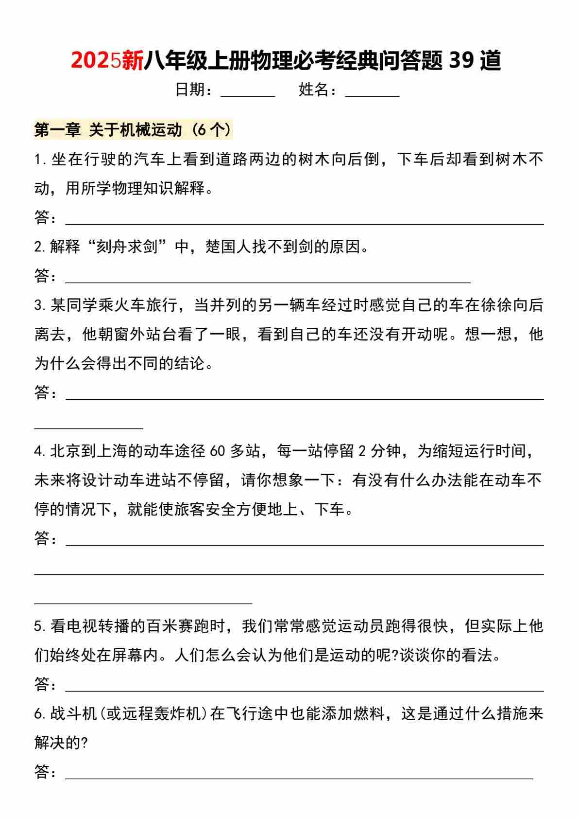 八上物理必考经典问答题39道