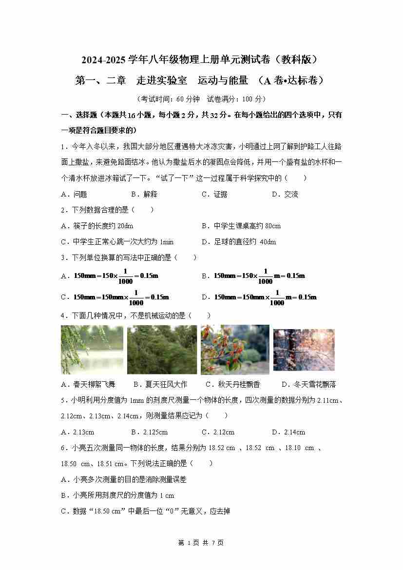 第1、2章:机械运动、运动和能量【A卷 达标卷】(原卷版)