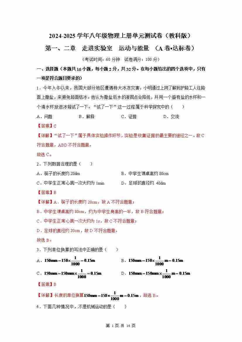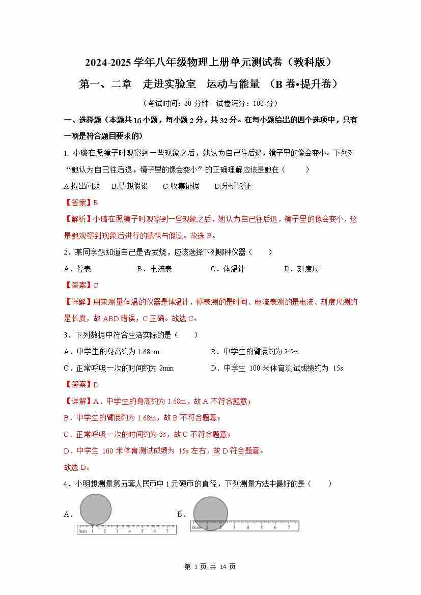 第1、2章:机械运动、运动和能量【B卷 提升卷】(解析版)