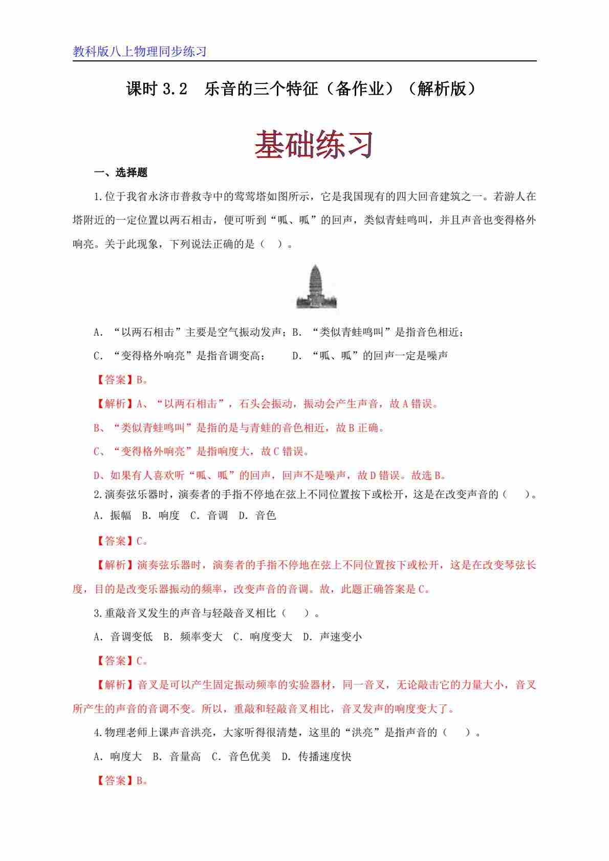 【教科物理】3.2 乐音的三个特征(同步练习)(解析版)