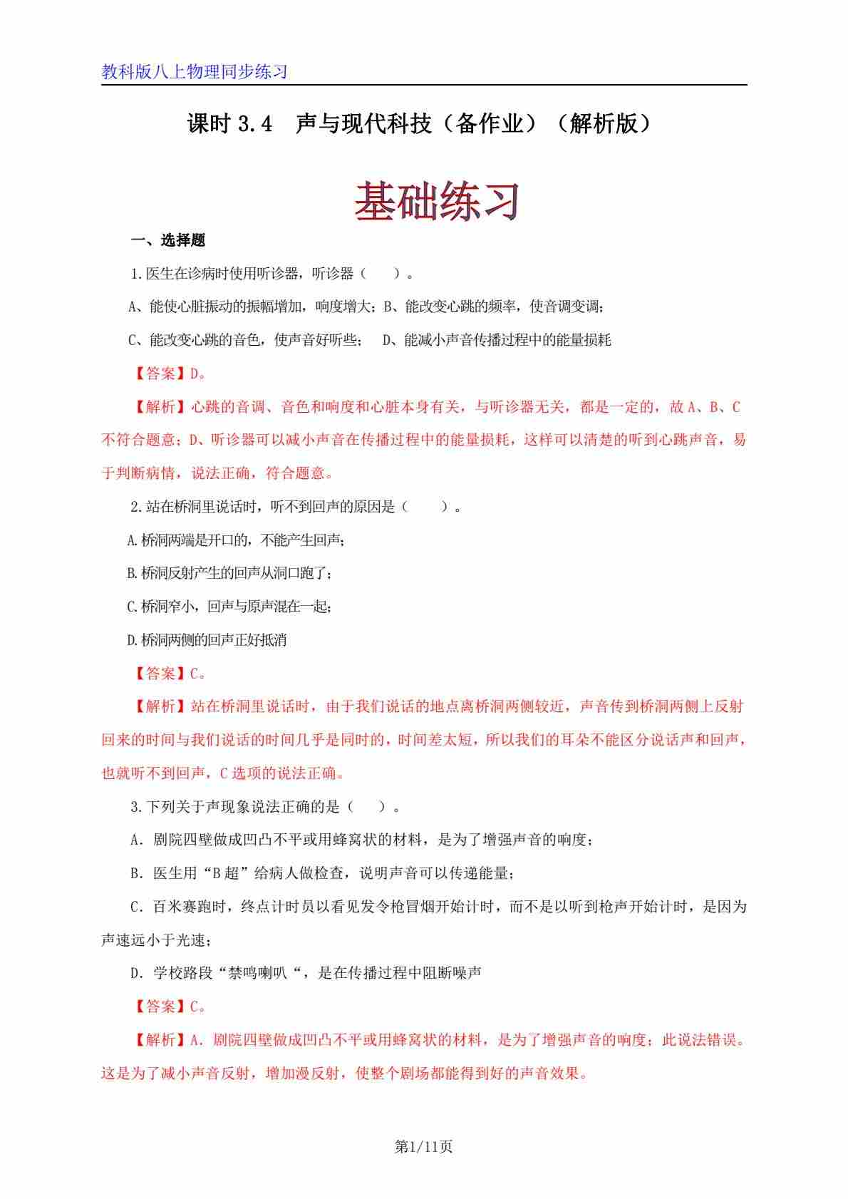 【教科物理】3.4 声与现代科技(同步练习)(解析版)