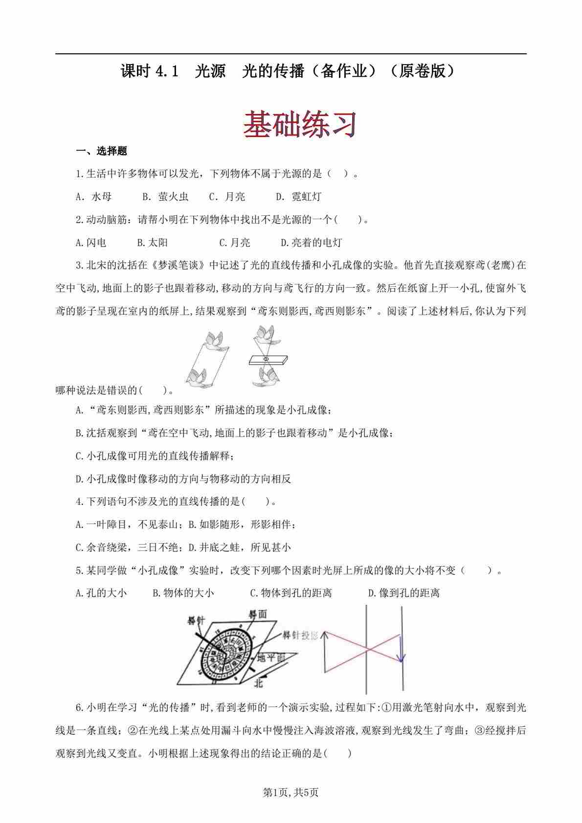【教科物理】4.1 光源 光的传播(同步练习)(原卷版)