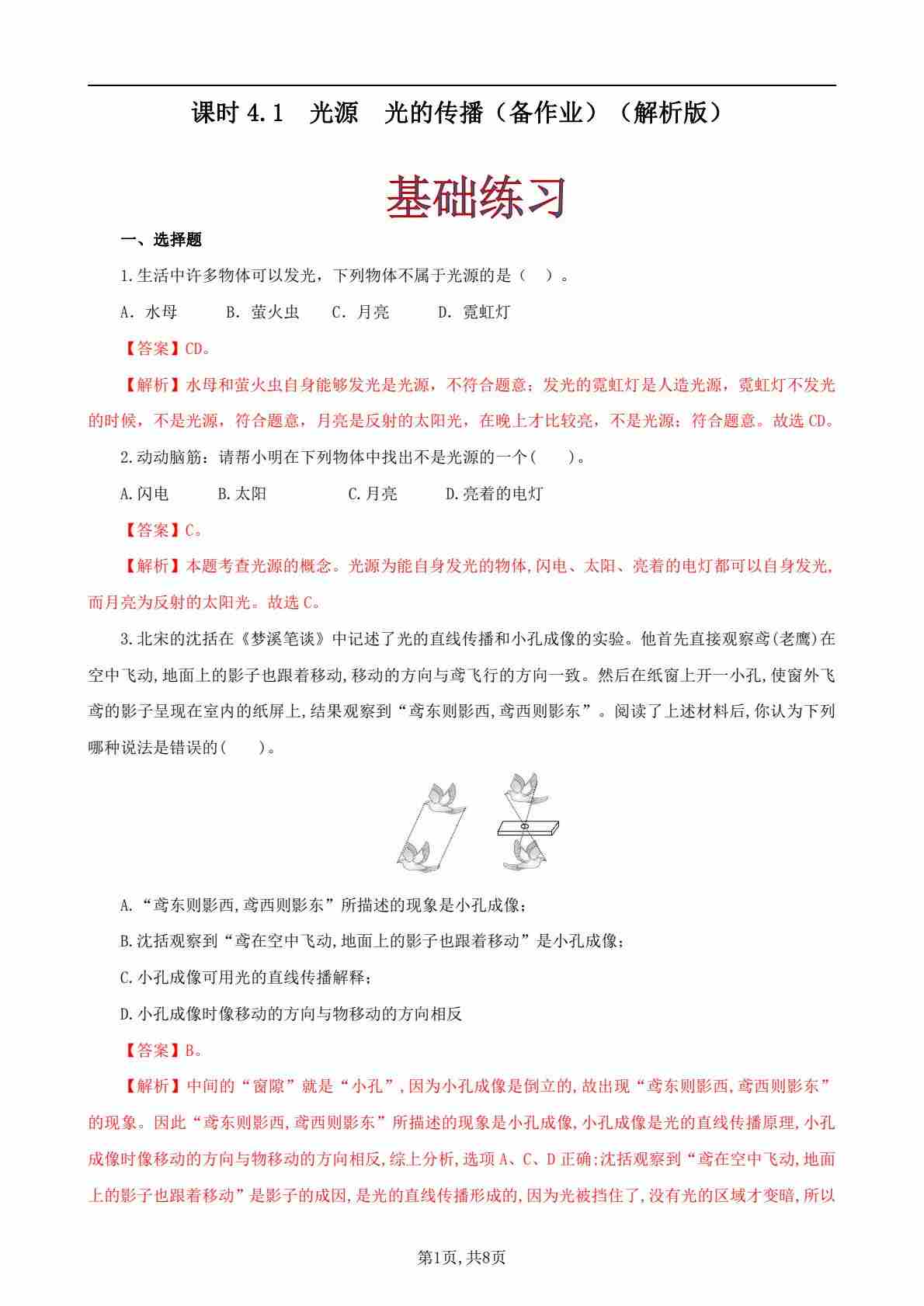 【教科物理】4.1 光源 光的传播(同步练习)(解析版)