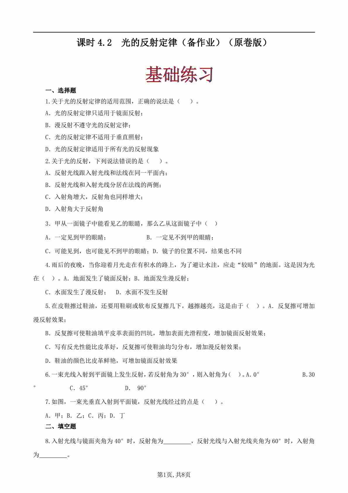 【教科物理】4.2 光的反射定律(同步练习)(原卷版)