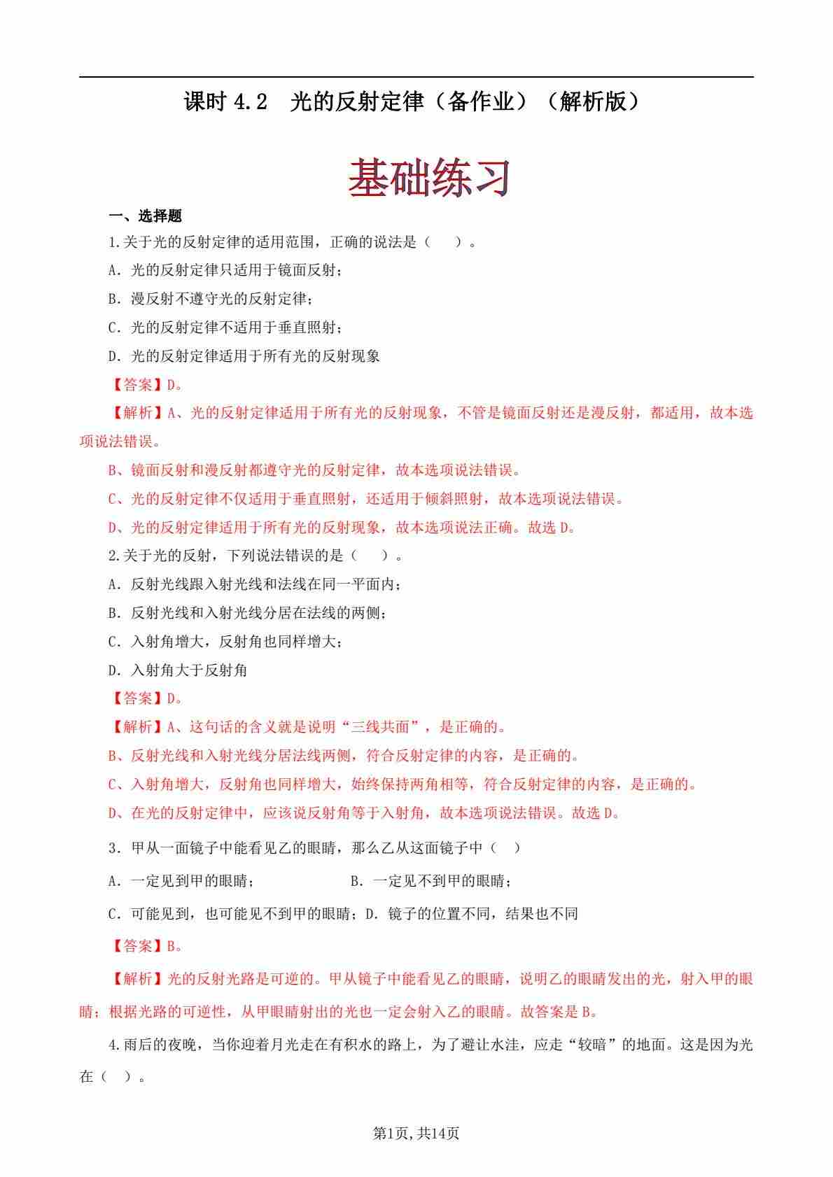 【教科物理】4.2 光的反射定律(同步练习)(解析版)