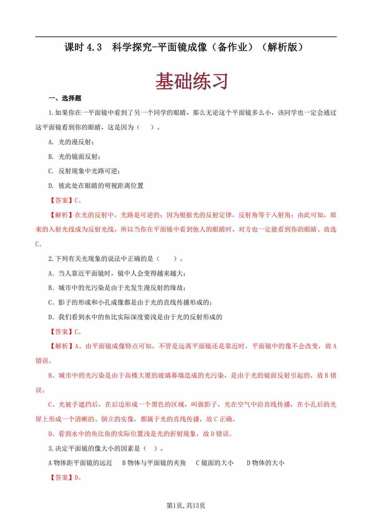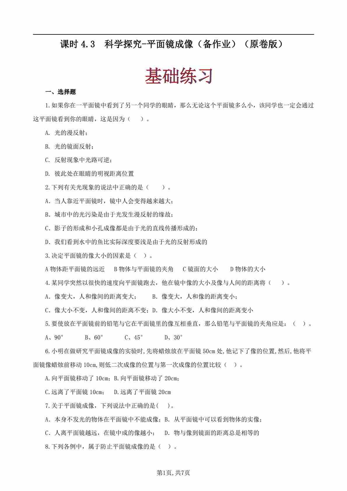 【教科物理】4.3 科学探究-平面镜成像(同步练习)(原卷版)