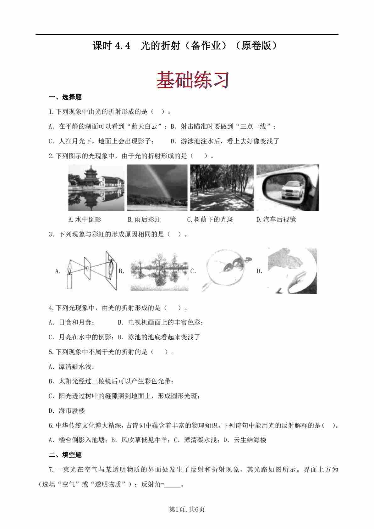 【教科物理】4.4 光的折射(同步练习)(原卷版)