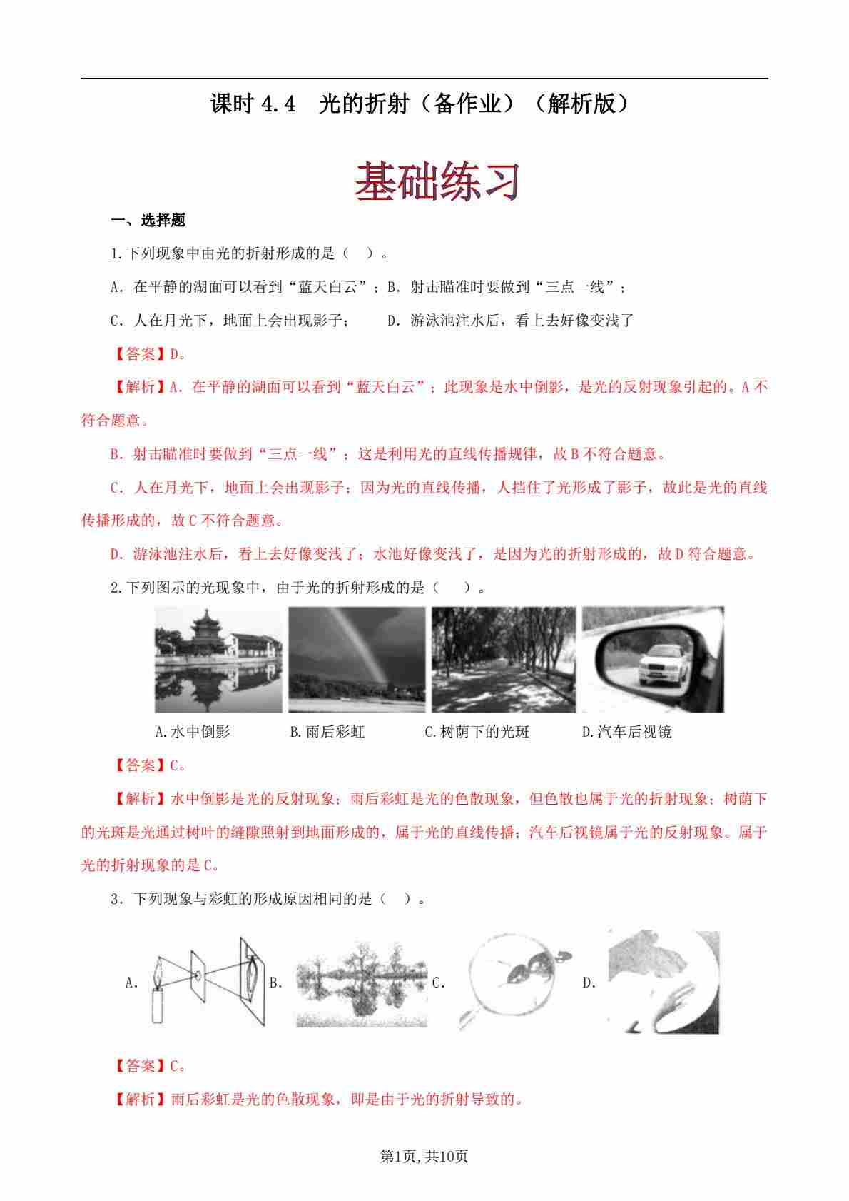 【教科物理】4.4 光的折射(同步练习)(解析版)