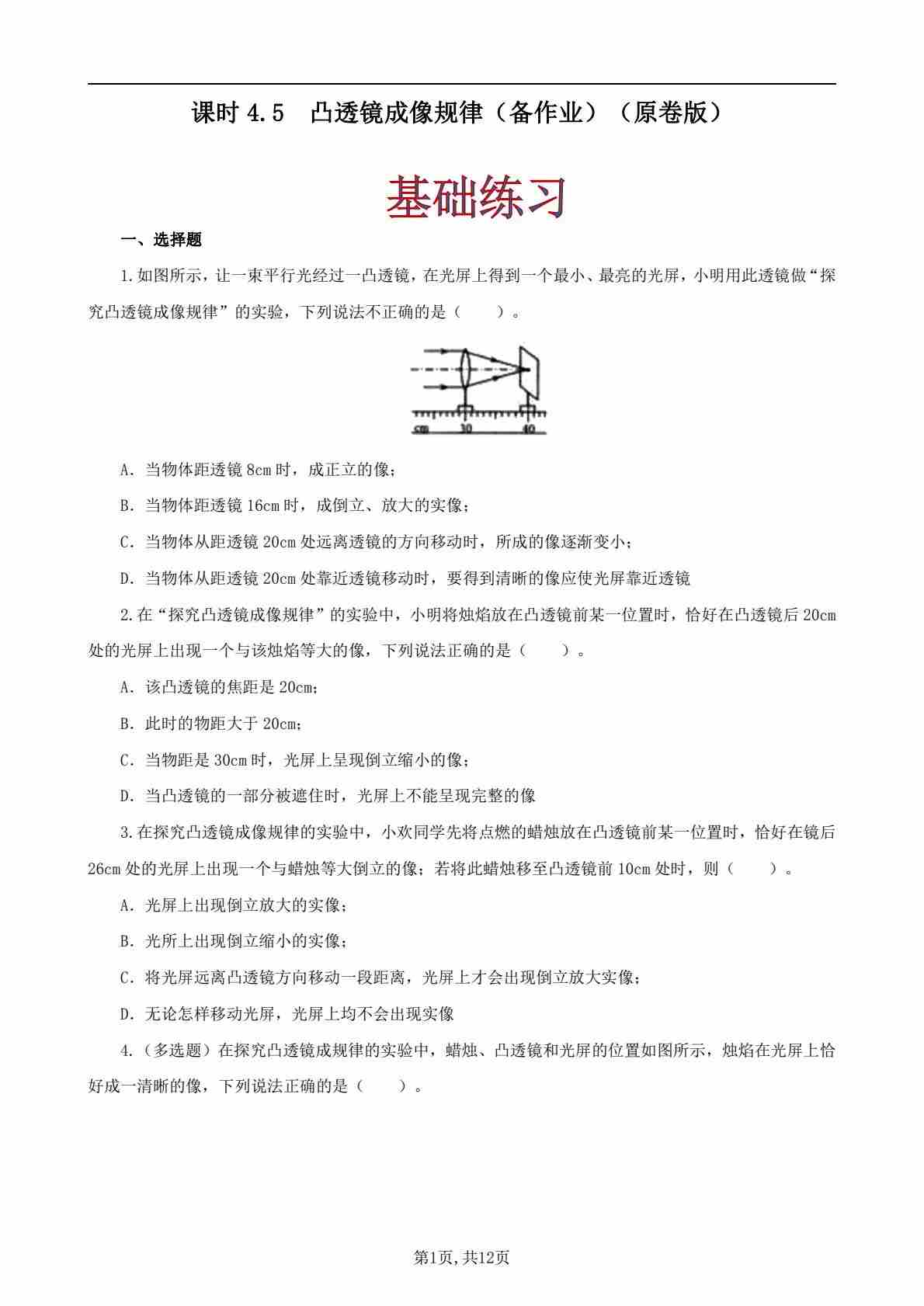 【教科物理】4.5 科学探究-凸透镜成像(同步练习)(原卷版)