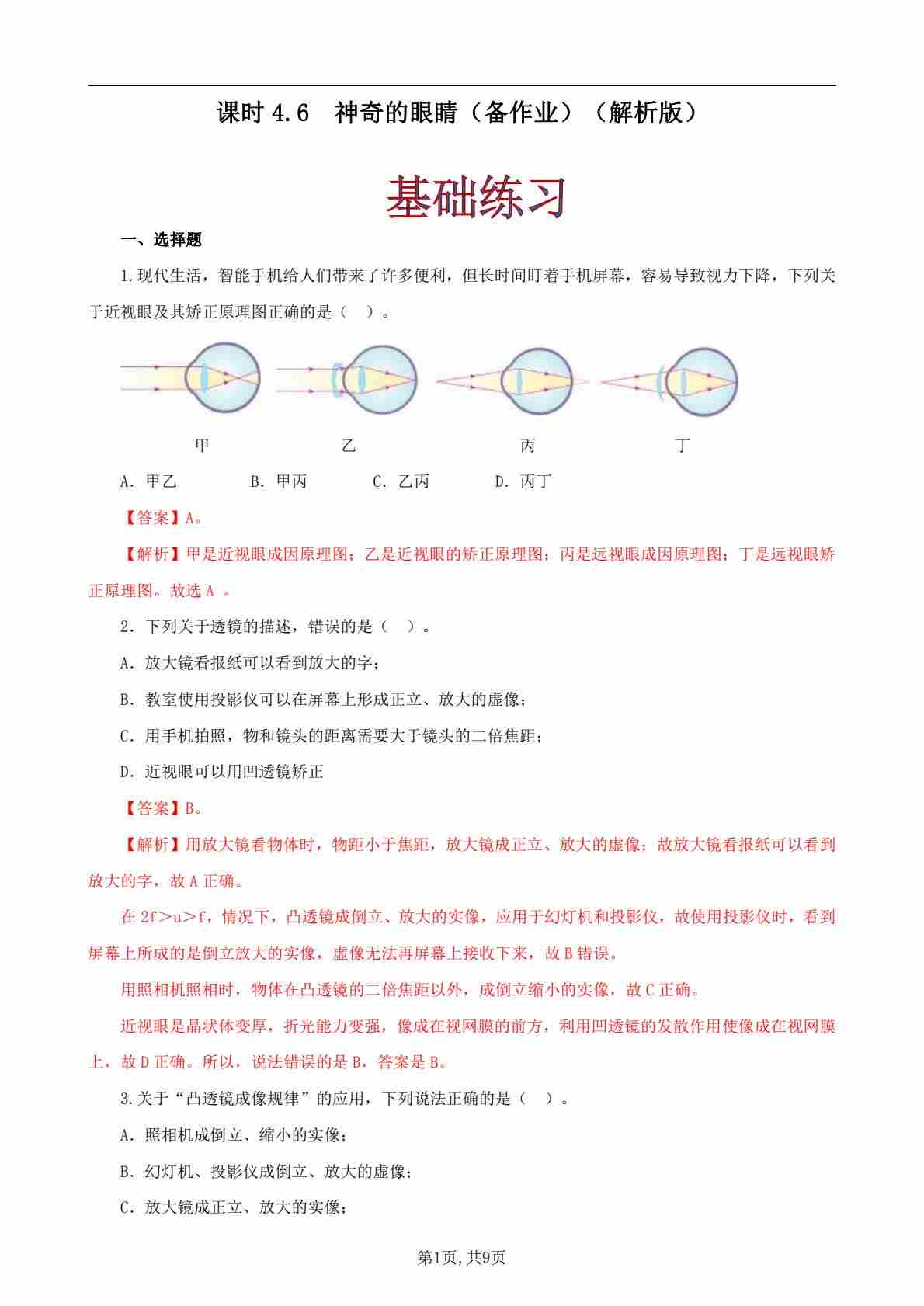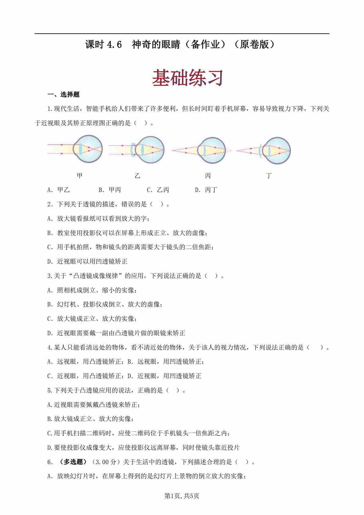 【教科物理】4.6 神奇的眼睛(同步练习)(原卷版)