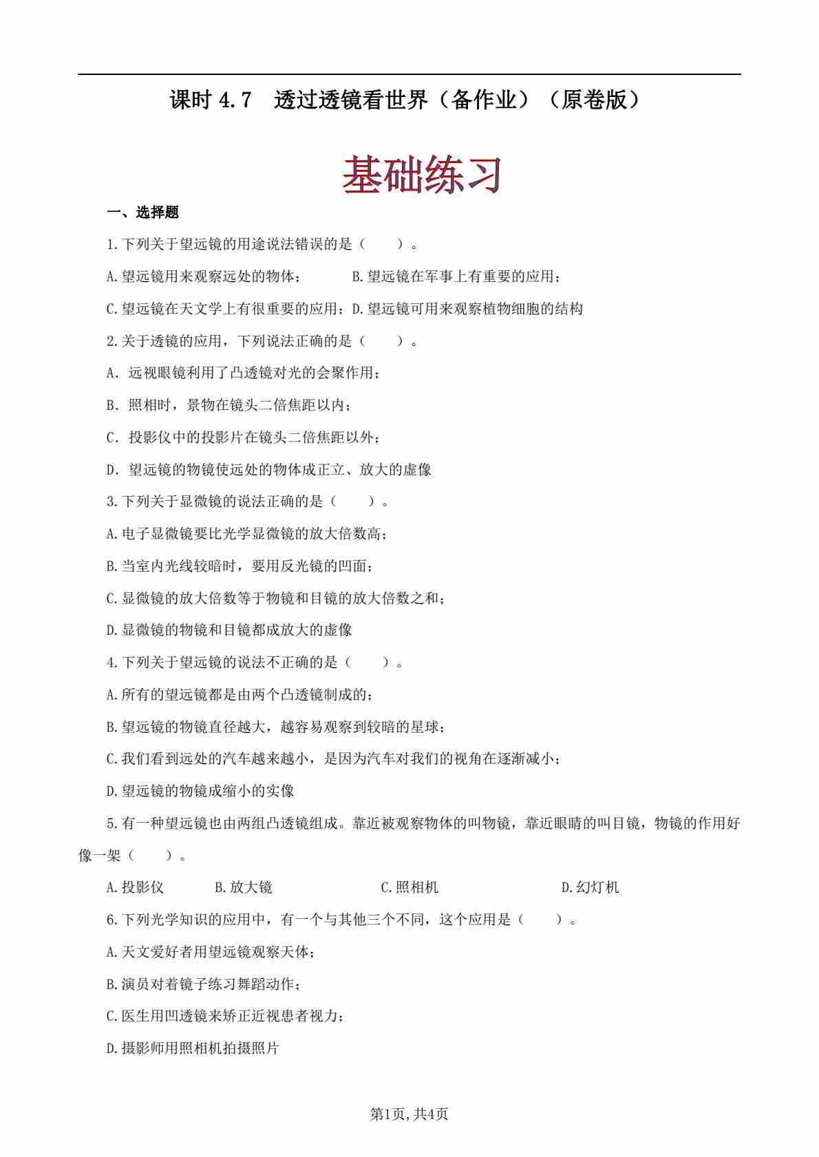 【教科物理】4.7 透过透镜看世界(同步练习)(原卷版)