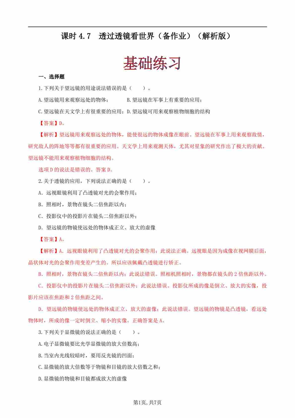 【教科物理】4.7 透过透镜看世界(同步练习)(解析版)