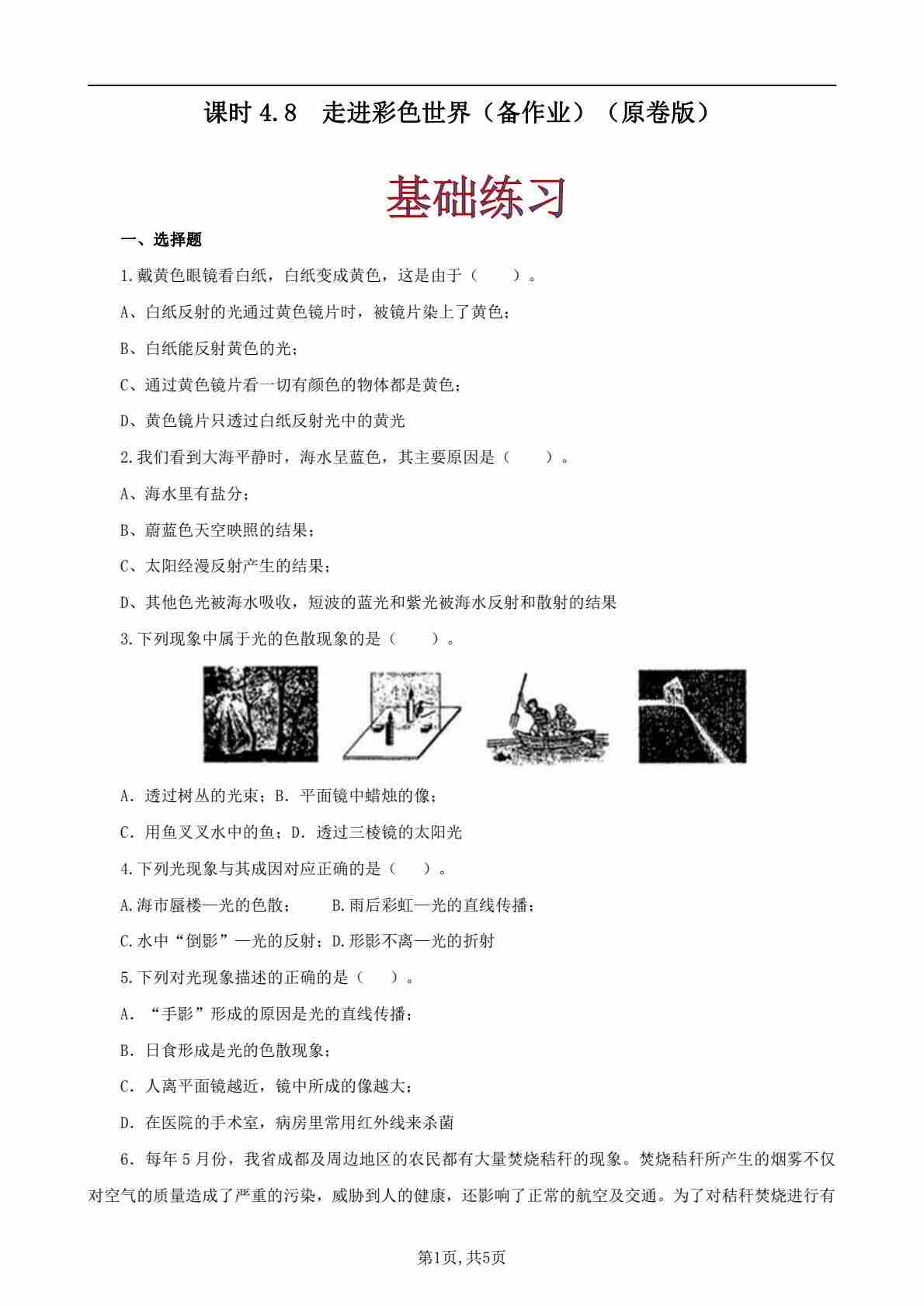 【教科物理】4.8 走进彩色的世界(同步练习)(原卷版)