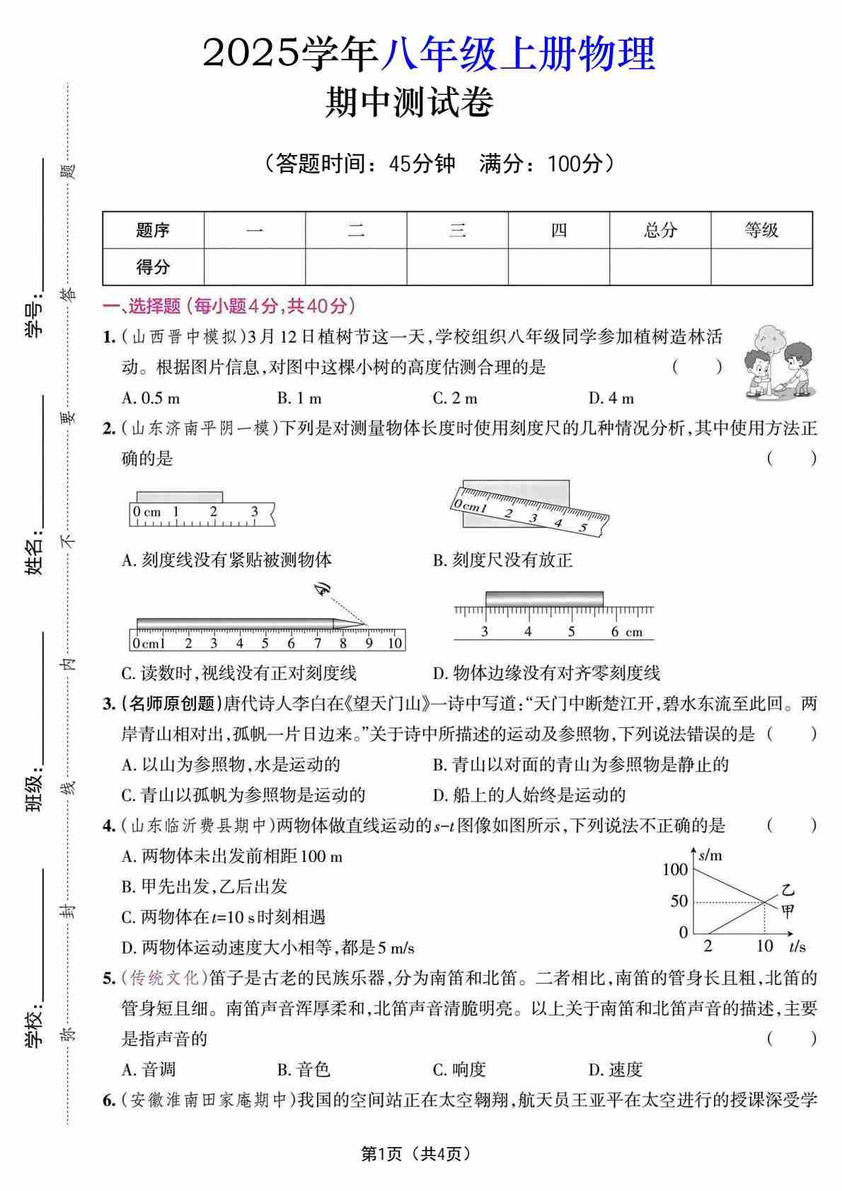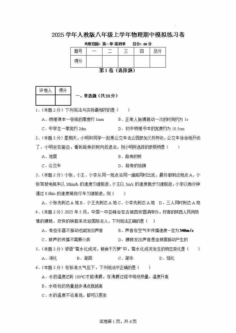 2025学年人教版物理八年级上册++期中考试物理试卷
