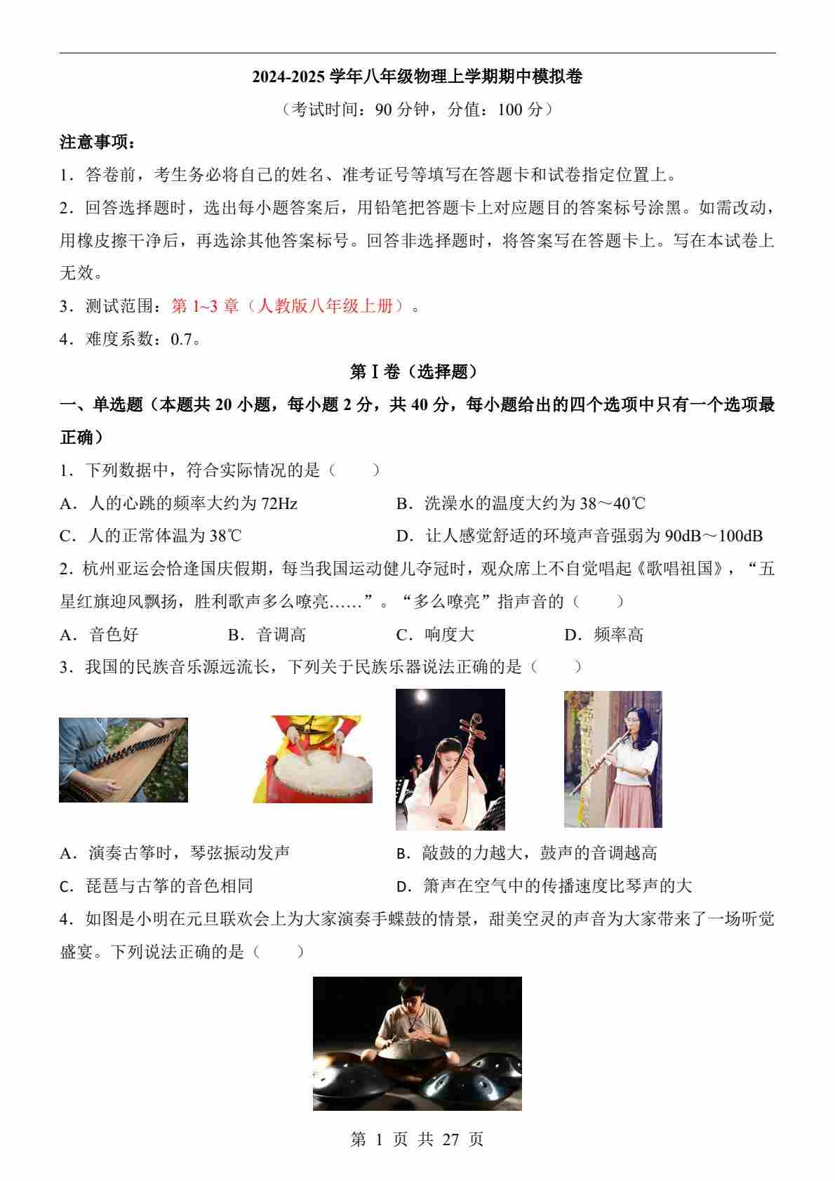 【人教】8上物理期中卷【1-3章】
