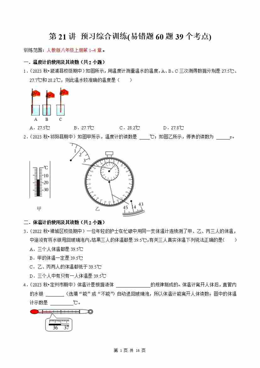 第21讲 预习综合训练(易错题60题39个考点)(原卷版)