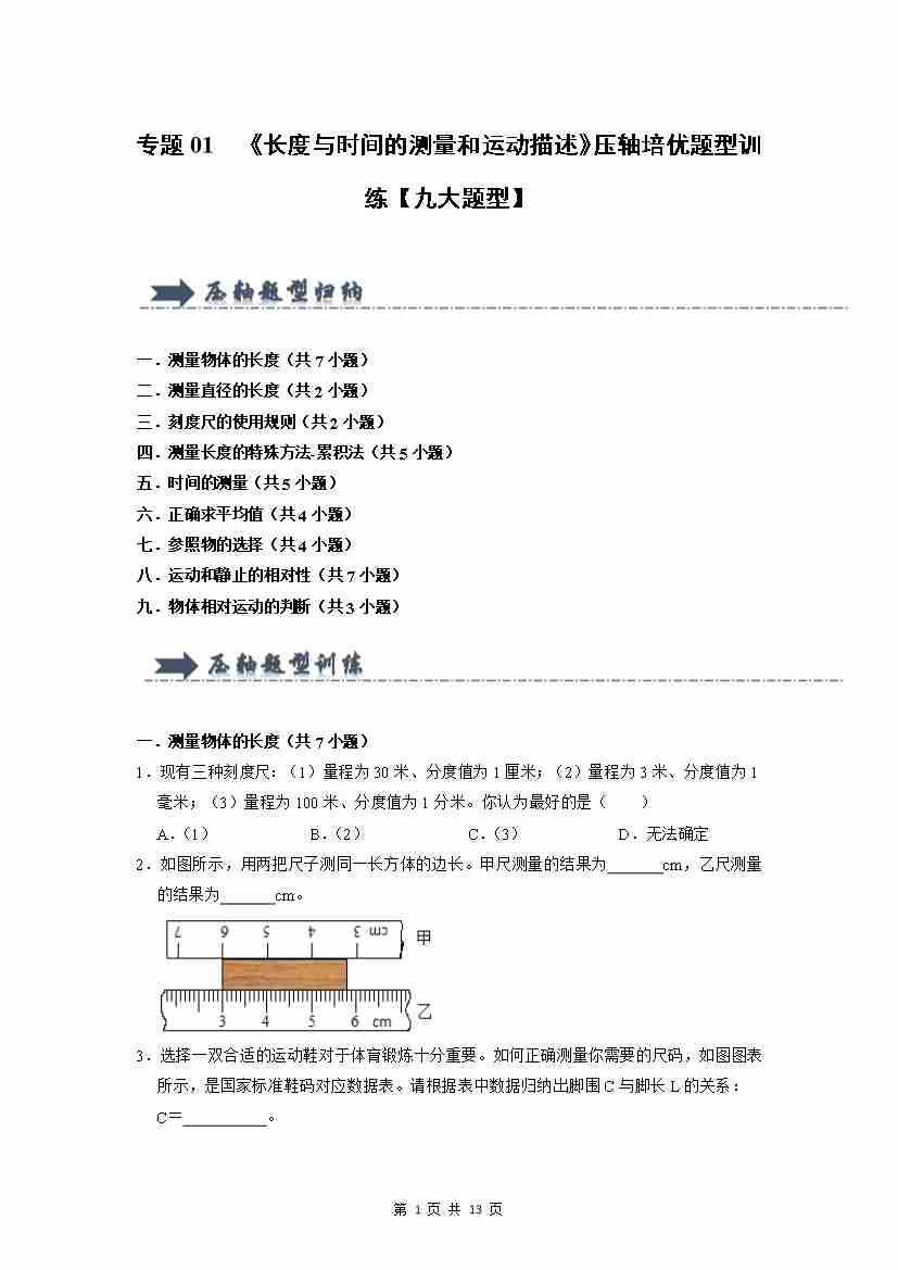 专题01 《长度与时间的测量和运动描述》压轴培优题型训练【九大题型】(原卷版)