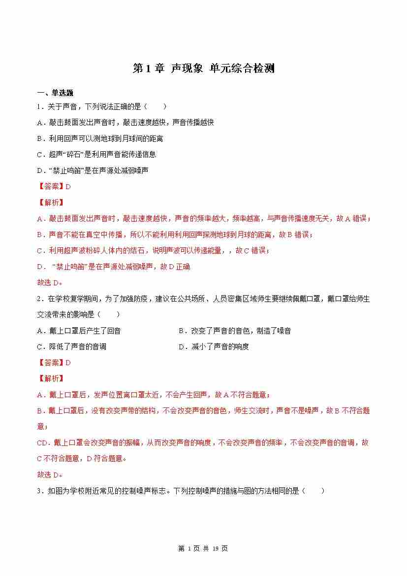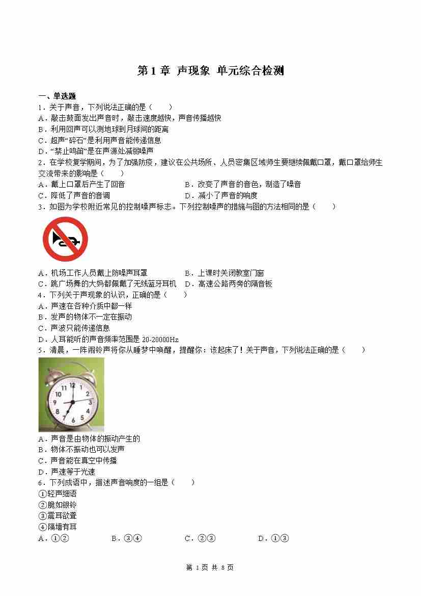 第1章 声现象 单元综合检测(练习)(原卷版)